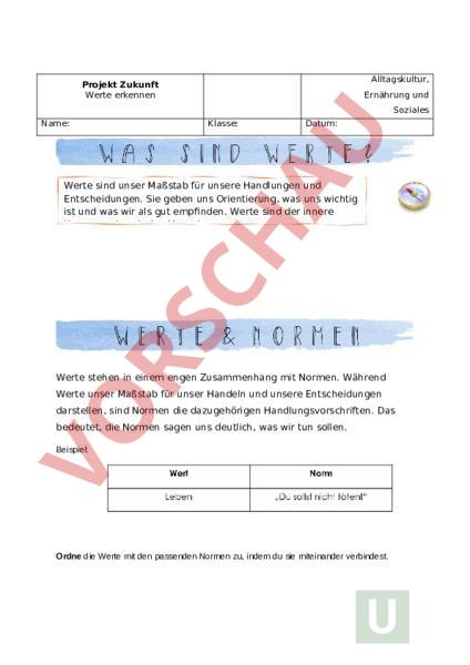 Alltagskultur, Projekt Zukunft Werte erkennen Ernährung und Soziales Name: Klasse: Datum: Werte sind unser Maßstab für unsere Handlungen und Entscheidungen. Sie geben uns Orientierung, was uns wichtig ist und was wir als gut empfinden. Werte sind der innere Kompass eines jeden Menschen. Werte stehen in einem engen Zusammenhang mit Normen. Während Werte unser Maßstab für unser Handeln und unsere Entscheidungen darstellen, sind Normen die dazugehörigen Handlungsvorschriften. Das bedeutet, die Normen sagen uns deutlich, was wir tun sollen. Beispiel: Ordne die Werte mit den passenden Normen zu, indem du sie miteinander verbindest. Übertrage hier deine Rangfolge der Werte. Übertragt eure fünf wichtigsten Werte. 1, 3. 2. 4. 5. Vergleicht eure fünf Werte mit den „Ausgangswerten. Was hat sich während der Wanderung geändert? Erläutere warum sich etwas geändert hat. Unsere Klassenwerte sind