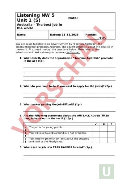 Listening NW 5 Unit 1 (S) Note: Australia – The best job in the world Name: Datum: 11.11.2025 Punkte: /19P. You are going to listen to an advertisement by Tourism Australia, the organization that promotes Australia. The advertisement is about the best job in the world. First, read through the questions below. Then listen to the advertisement. Write down your answers in German. 1. What exactly does the organization Tourism Australia promote in the ad? (4p.) 2. What do you have to do if you want to apply for the job(s)? (2p.) 3. What makes getting the job difficult? (1p.) 4. Are the following statement about the OUTBACK ADVENTURER true, false or not in the text? (1.5p.) ) ) ) The job is for young people. You will pilot tourists around in hot air ballon. You need to get to know facts about the customs and food of the Aboriginies. 5. Where is the job of PARK RANGER located? (1p.) 6. What are the main tasks of PARK RANGER? Note down three things mentioned in the text. (3p.) 7. Are the following statement about the WILDLIFE CARETAKER true, false or not in the text? (1.5p.) ) The job is located on an island in southern Australia. ) ) You will be able to talk with walkie-talkies. You cant use car when travelling around. 8. What skills would you need for the job of LIFESTYLE PHOTOJOURNALIST? Note down two. (2p.) 9. Name two things you need to do as TASTE MASTER. (2p.) 10. Are the following statement about the CHIEF FUNSTER true, false or not in the text? (1.5p.) ) As chief funster, you would be based in New South Wales. ) The job is for someone who is interested in animals. ) The job includes travelling around. 11. Match the descriptions with the jobs. outback adventurer park ranger wildlife caretak er lifestyle photojourna list taste master chief funster Take care of nature and culture in large state with varied geography Find interesting adventures and work opportuniti es for young people Take care of nature on small island Promote citys events and things to do using social media Produce magazine articles on free time and entertainm ent activities Promote the food and beverage industry Audio: best-job-world