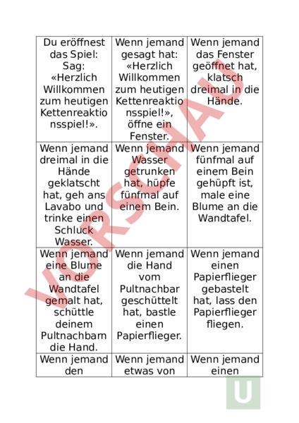Du eröffnest das Spiel: Sag: «Herzlich Willkommen zum heutigen Kettenreaktio nsspiel!». Wenn jemand gesagt hat: «Herzlich Willkommen zum heutigen Kettenreaktio nsspiel!», öffne ein Fenster. Wenn jemand Wenn jemand dreimal in die Wasser Hände getrunken geklatscht hat, hüpfe hat, geh ans fünfmal auf Lavabo und einem Bein. trinke einen Schluck Wasser. Wenn jemand Wenn jemand eine Blume die Hand an die vom Wandtafel Pultnachbar gemalt hat, geschüttelt schüttle hat, bastle deinem einen Pultnachbarn Papierflieger. die Hand. Wenn jemand Wenn jemand den etwas von Wenn jemand das Fenster geöffnet hat, klatsch dreimal in die Hände. Wenn jemand fünfmal auf einem Bein gehüpft ist, male eine Blume an die Wandtafel. Wenn jemand einen Papierflieger gebastelt hat, lass den Papierflieger fliegen. Wenn jemand einen Papierflieger Sternschnupp Schrank fliegen liess, gesagt hat, geöffnet hat, sag: «Wow, öffne einen geh zum habt ihr auch Schrank. Schrank und diese sag: «Mmh, Sternschnupp das Krokodil gesehen?». ist weg». Wenn jemand Wenn jemand Wenn jemand etwas von das Fenster dreimal an Krokodil wieder die Tür gesagt hat, geschlossen geklopft hat, schliess das hat, klopf schliess den Fenster dreimal an Schrank wieder. die Tür. wieder. Wenn jemand Wenn jemand Wenn jemand den Schrank fünfmal auf im Kreis geschlossen den Boden gelaufen ist, hat, stampf gestampft sag: «Ende!» fünfmal auf hat, lauf den Boden. einmal im Kreis.