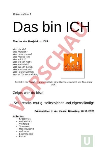 Präsentation 1 Das bin ICH Mache ein Projekt zu DIR. Wer bin ich? Was mag ich? Was passt zu mir? Was mache ich? Was will ich? Was will ich nicht? Was weiss ich? Was tue ich gerne? Was wird aus mir? Was ist mir wichtig? Wer ist für mich wichtig? Gestalte ein Plakat, ein Musikstück, eine Kartonschachtel, ein Film über dich. Zeige, wer du bist! Sei kreativ, mutig, selbstsicher und eigenständig! Präsentation in der Klasse: Dienstag, 18.11.2025 Kriterien: Kreativität Authentisch Vielfältig Spannend Überzeugend Auftreten Eigenständig Plakat