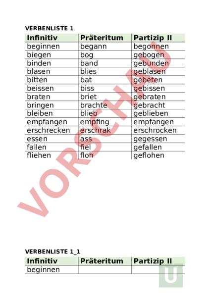 VERBENLISTE 1 Infinitiv beginnen biegen binden blasen bitten beissen braten bringen bleiben empfangen erschrecken essen fallen fliehen Präteritum begann bog band blies bat biss briet brachte blieb empfing erschrak ass fiel floh Partizip II begonnen gebogen gebunden geblasen gebeten gebissen gebraten gebracht geblieben empfangen erschrocken gegessen gefallen geflohen VERBENLISTE 1_1 Infinitiv beginnen Präteritum Partizip II biegen binden blasen bitten beissen braten bringen bleiben empfangen erschrecken essen fallen fliehen VERBENLISTE 1_2 Infinitiv fallen Präteritum Partizip II briet geflohen bat beissen brachte geblasen bleiben erschrocken begann biegen gebunden empfangen gegessen VERBENLISTE 1 Infinitiv Präteritum Partizip II begonnen gebogen gebunden geblasen gebeten gebissen gebraten gebracht geblieben empfangen erschrocken gegessen gefallen geflohen