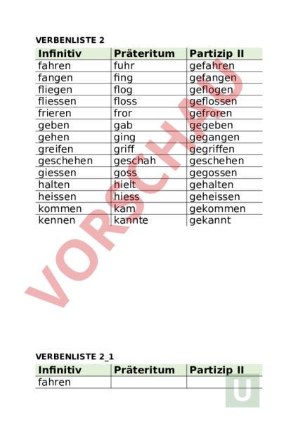 VERBENLISTE 2 Infinitiv fahren fangen fliegen fliessen frieren geben gehen greifen geschehen giessen halten heissen kommen kennen Präteritum fuhr fing flog floss fror gab ging griff geschah goss hielt hiess kam kannte Partizip II gefahren gefangen geflogen geflossen gefroren gegeben gegangen gegriffen geschehen gegossen gehalten geheissen gekommen gekannt VERBENLISTE 2_1 Infinitiv fahren Präteritum Partizip II fangen fliegen fliessen frieren geben gehen greifen geschehen giessen halten heissen kommen kennen VERBENLISTE 2_2 Infinitiv fahren Präteritum Partizip II fing geflogen fliessen fror gegeben gehen griff geschehen giessen hielt geheissen kommen kannte VERBENLISTE 2_3 Infinitiv Präteritum Partizip II gegriffen geschehen gegossen gehalten geflossen gefroren gegeben geheissen gekommen gekannt gefahren gefangen geflogen gegangen
