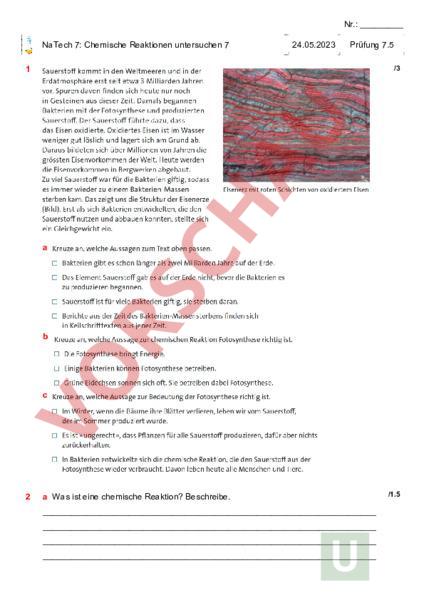 Nr.: NaTech 7: Chemische Reaktionen untersuchen 7 24.05.2023 Prüfung 7.5 /3 1 2 Was ist eine chemische Reaktion? Beschreibe. /1.5 Welche der folgenden Situationen sind chemische Reaktionen. Kreuze an: /2 Glace schmelzen Fleisch braten Stern leuchtet Wasserdampf resublimiert Pflanze produziert Zucker Strom fliesst Eisen rostet Kaffee kochen 3 Notiere zu folgender chemischen Reaktion die Ausgangsstoffe, die Reaktion und die Produkte und kreuze im Reaktionsschema an. /2 Fotosynthese: /3 4 Notiere nun die beiden anderen. 5 Aufgeführt sind einige Stoffe. Streiche die Gemische durch. Bei den Reinstoffen entscheidest du dich, ob es Elemente (E) molekulare Stoffe (M) oder Salze (S) sind und schreibst den entsprechenden Buchstaben in die Klammer: Erde (.) Stickstoff (.) Eisensulfid (.) Kohlenstoffdioxid (.) Wasser (.) Natriumchlorid (.) Methangas (CH4) (.) Schwefel(.) Sirup (.) Silberoxid (.) Luft (.) Uran (.) /3 6 Wir haben zusammen betrachtet wie Eisen und Schwefel zu Eisen-Schwefel-Gemisch und durch eine chemische Reaktion zu Eisensulfid wird. Zeichne nun im Atommodell, wie man sich ein Gemisch und eine Verbindung vorstellt. (es muss nicht Schwefel und Eisen sein): Gemisch Verbindung 7 Warum wird Eisenwolle schwerer, wenn sie verbrannt wird? /1 /1.5 8 Stelle folgende Reaktionen mit den 6 Energiewürfeln dar. Wo haben wir vor der Reaktion welche Energieform, wie sieht es nachher aus? Fotosynthese Vorher: Umgebung Nachher: Umgebung Feuer mit Wasser löschen. Vorher: Umgebung Nachher: Umgebung /3 9 a) Ordne folgende Begriffe den Nummern zu (einige Nummer haben mehrere Begriffe): /2 Stoffe (); in mol/g (); Symbol (); Ordnungszahl (); Stoffname (); Atome () Atommasse (); Formel bei Molekülen () 1 5 b) Mache aus den erfundenen Elementen auf dem Zusatzblatt ein Periodensystem, die Zahl stellt die Atommasse dar, die gleiche Farbe gleiche Eigenschaften. Für die Lücke darfst du selber ein Atom samt Masse erfinden. Wie viele Gruppen und wie viele Perioden hat dieses System? 10 Heft Zusatz: Das griechische Wort „atomos bedeutet. Name: Nummer: /3 /2 /0.5 Zeltnium 41 Gautschium 15 Haribonium 13 Hawaiium 50 Portium 18 Sagium 37 Ugandium 45 Wildeggium 24 Colaium 48 Bezium 27 Maagium 22 Schoggium 33 Zeltnium 41 Gautschium 15 Haribonium 13 Hawaiium 50 Portium 18 Sagium 37 Ugandium 45 Wildeggium 24 Colaium 48 Bezium 27 Maagium 22 Schoggium 33 Zeltnium 41 Gautschium 15 Haribonium 13 Hawaiium 50 Portium 18 Sagium 37 Ugandium 45 Wildeggium 24 Colaium 48 Bezium 27 Maagium 22 Schoggium 33 Zeltnium 41 Gautschium 15 Haribonium 13 Hawaiium 50 Portium 18 Sagium 37 Ugandium 45 Wildeggium 24 Colaium 48 Bezium 27 Maagium 22 Schoggium 33 Zeltnium 41 Gautschium 15 Haribonium 13 Hawaiium 50 Portium 18 Sagium 37 Ugandium 45 Wildeggium 24 Colaium 48 Bezium 27 Maagium 22 Schoggium 33