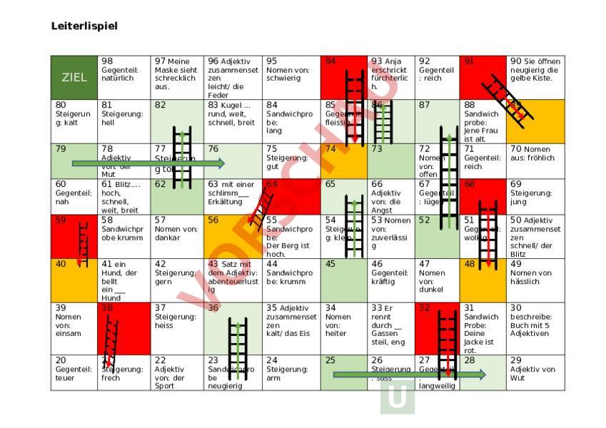 Leiterlispiel 98 97 Meine 96 Adjektiv 95 Gegenteil: natürlich Maske sieht schrecklich aus. Nomen von: schwierig 80 81 82 Steigerun g: kalt Steigerung: hell zusammenset zen leicht/ die Feder 83 Kugel rund, weit, schnell, breit 79 78 77 Steigerun toll 76 60 Adjektiv von: der Mut 61 Blitz. hoch, schnell, weit, breit 62 63 mit einer 64 65 59 58 57 56 55 54 Sandwichpr obe krumm Nomen von: dankar Sandwichpro be: Der Berg ist hoch. Steigerun g: klein 41 ein 42 43 Satz mit 44 45 Hund, der bellt ein Hund Steigerung: gern dem Adjektiv: abenteuerlust ig Sandwichpro be: krumm 38 37 36 35 Adjektiv zusammenset zen kalt/ das Eis 24 ZIEL Gegenteil: nah 40 39 Nomen von: einsam 20 Gegenteil: teuer Steigerung: frech 22 Adjektiv von: der Sport 84 85 Sandwichpro be: lang Gegenteil: fleissig 75 74 93 Anja 92 erschrickt fürchterlic h. Gegenteil reich 86 87 schlimm_ Erkältung 23 Sandwichpro be neugierig Steigerung: arm 91 90 Sie öffnen neugierig die gelbe Kiste. 88 89 Sandwich probe: Jene Frau ist alt. 73 Steigerung: gut Steigerung: heiss 21 94 66 Adjektiv von: die Angst 53 Nomen von: zuverlässi 72 71 70 Nomen Nomen von: offen Gegenteil: reich aus: fröhlich 67 68 69 52 51 50 Adjektiv Gegenteil: wolkig zusammenset zen schnell/ der Blitz 48 49 Gegenteil lügen 46 47 Gegenteil: kräftig Nomen von: dunkel 34 33 Er 32 Nomen von: heiter rennt durch Gassen steil, eng 25 26 Steigerung süss 27 Gegenteil langweilig Steigerung: jung Nomen von hässlich 31 30 Sandwich Probe: Deine Jacke ist rot. beschreibe: Buch mit 5 Adjektiven 28 29 Adjektiv von Wut Leiterlispiel 19 START 18 17 Steigerung: alt Sandwichpr obe lachen 1 Zum 2 Znüni esse ich immer eine Frucht. Gegenteil von: mutig 16 3 Ein guter Autofahrer fährt 15 Sandwichpro be erschrecken 4 beschreibe: Kleider mit 5 Adjektiven 14 5 13 Nomen 12 11 10 von: frei Steigerun g: weich Gegenteil: schnell 8 9 Daumen. 6 Gegenteil: hoch 7 Nomen von: ehrlich Steigerun g: leicht hoch, schnell, weit, breit