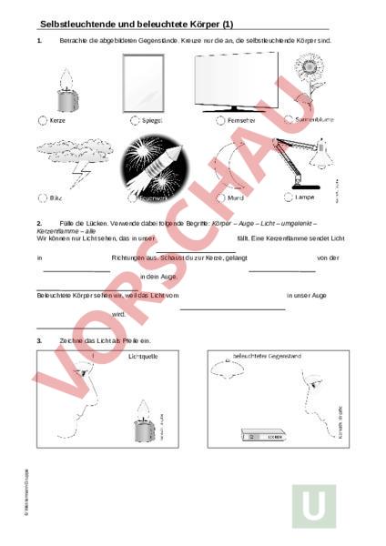 Selbstleuchtende und beleuchtete Körper (1) 1. Betrachte die abgebildeten Gegenstände. Kreuze nur die an, die selbstleuchtende Körper sind. 2. Fülle die Lücken. Verwende dabei folgende Begriffe: Körper – Auge – Licht – umgelenkt – Kerzenflamme – alle Wir können nur Licht sehen, das in unser fällt. Eine Kerzenflamme sendet Licht in Richtungen aus. Schaust du zur Kerze, gelangt von der in dein Auge. Beleuchtete Körper sehen wir, weil das Licht vom wird. Westermann Gruppe 3. Zeichne das Licht als Pfeile ein. in unser Auge