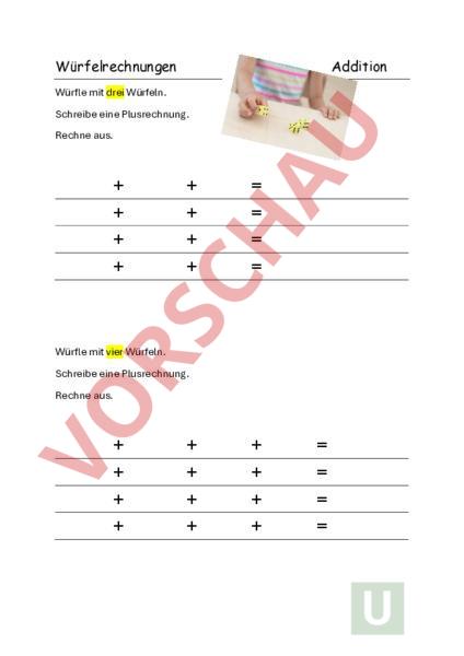 Würfelrechnungen Addition Würfle mit drei Würfeln. Schreibe eine Plusrechnung. Rechne aus. Würfle mit vier Würfeln. Schreibe eine Plusrechnung. Rechne aus.