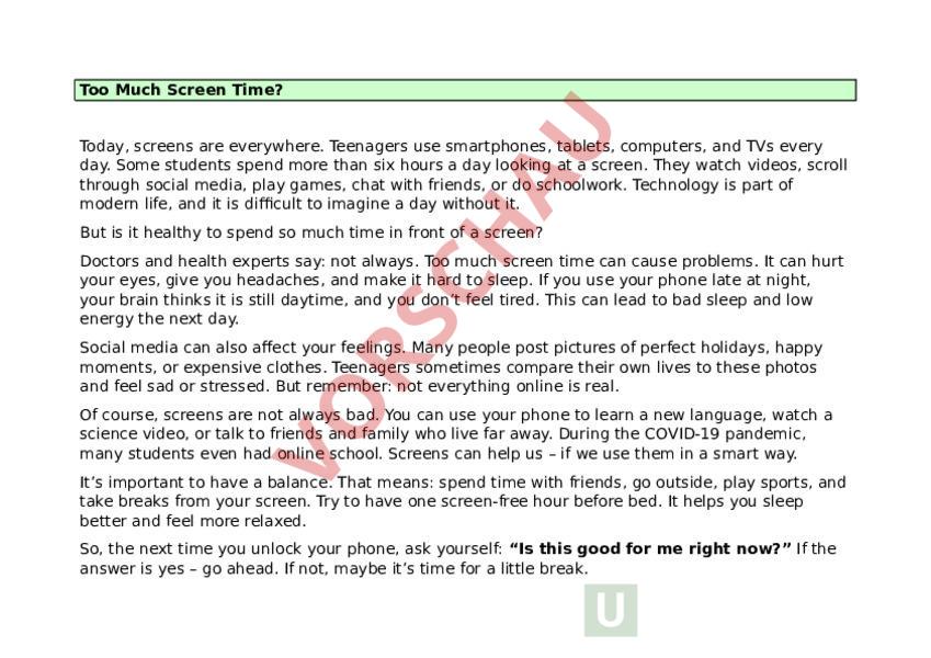 Too Much Screen Time? Today, screens are everywhere. Teenagers use smartphones, tablets, computers, and TVs every day. Some students spend more than six hours day looking at screen. They watch videos, scroll through social media, play games, chat with friends, or do schoolwork. Technology is part of modern life, and it is difficult to imagine day without it. But is it healthy to spend so much time in front of screen? Doctors and health experts say: not always. Too much screen time can cause problems. It can hurt your eyes, give you headaches, and make it hard to sleep. If you use your phone late at night, your brain thinks it is still daytime, and you dont feel tired. This can lead to bad sleep and low energy the next day. Social media can also affect your feelings. Many people post pictures of perfect holidays, happy moments, or expensive clothes. Teenagers sometimes compare their own lives to these photos and feel sad or stressed. But remember: not everything online is real. Of course, screens are not always bad. You can use your phone to learn new language, watch science video, or talk to friends and family who live far away. During the COVID-19 pandemic, many students even had online school. Screens can help us – if we use them in smart way. Its important to have balance. That means: spend time with friends, go outside, play sports, and take breaks from your screen. Try to have one screen-free hour before bed. It helps you sleep better and feel more relaxed. So, the next time you unlock your phone, ask yourself: Is this good for me right now? If the answer is yes – go ahead. If not, maybe its time for little break. Vocabulary Word Phrase Meaning (in German) scroll through durchblättern (z. B. Social Media) low energy wenig Energie, müde compare vergleichen screen-free ohne Bildschirm in smart way auf kluge Weise Reading Comprehension – Answer in English 1. What are four things teenagers often do with screens? 2. What are two health problems caused by too much screen time? 3. Why can social media make teenagers feel sad? 4. What are two positive uses of screens mentioned in the text? 5. What are two tips to use screens in healthy way?