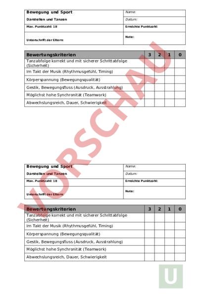 Bewegung und Sport Name: Darstellen und Tanzen Datum: Max. Punktzahl: 18 Erreichte Punktzahl: Unterschrift der Eltern: Note: Bewertungskriterien 3 2 1 0 2 1 0 Tanzabfolge korrekt und mit sicherer Schrittabfolge (Sicherheit) Im Takt der Musik (Rhythmusgefühl, Timing) Körperspannung (Bewegungsqualität) Gestik, Bewegungsfluss (Ausdruck, Ausstrahlung) Möglichst hohe Synchronität (Teamwork) Abwechslungsreich, Dauer, Schwierigkeit Bewegung und Sport Name: Darstellen und Tanzen Datum: Max. Punktzahl: 18 Erreichte Punktzahl: Unterschrift der Eltern: Note: Bewertungskriterien Tanzabfolge korrekt und mit sicherer Schrittabfolge (Sicherheit) Im Takt der Musik (Rhythmusgefühl, Timing) Körperspannung (Bewegungsqualität) Gestik, Bewegungsfluss (Ausdruck, Ausstrahlung) Möglichst hohe Synchronität (Teamwork) Abwechslungsreich, Dauer, Schwierigkeit 3