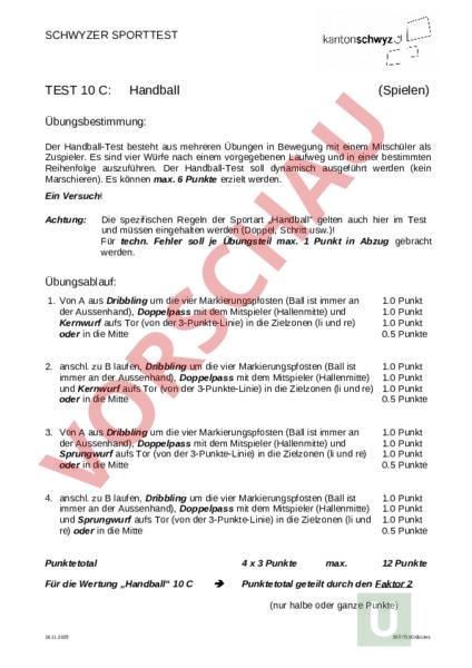 SCHWYZER SPORTTEST TEST 10 C: Handball (Spielen) Übungsbestimmung: Der Handball-Test besteht aus mehreren Übungen in Bewegung mit einem Mitschüler als Zuspieler. Es sind vier Würfe nach einem vorgegebenen Laufweg und in einer bestimmten Reihenfolge auszuführen. Der Handball-Test soll dynamisch ausgeführt werden (kein Marschieren). Es können max. 6 Punkte erzielt werden. Ein Versuch! Achtung: Die spezifischen Regeln der Sportart „Handball gelten auch hier im Test und müssen eingehalten werden (Doppel, Schritt usw.)! Für techn. Fehler soll je Übungsteil max. 1 Punkt in Abzug gebracht werden. Übungsablauf: 1. Von aus Dribbling um die vier Markierungspfosten (Ball ist immer an der Aussenhand), Doppelpass mit dem Mitspieler (Hallenmitte) und Kernwurf aufs Tor (von der 3-Punkte-Linie) in die Zielzonen (li und re) oder in die Mitte 1.0 Punkt 1.0 Punkt 1.0 Punkt 0.5 Punkte 2. anschl. zu laufen, Dribbling um die vier Markierungspfosten (Ball ist immer an der Aussenhand), Doppelpass mit dem Mitspieler (Hallenmitte) und Kernwurf aufs Tor (von der 3-Punkte-Linie) in die Zielzonen (li und re) oder in die Mitte 1.0 Punkt 1.0 Punkt 1.0 Punkt 0.5 Punkte 3. Von aus Dribbling um die vier Markierungspfosten (Ball ist immer an der Aussenhand), Doppelpass mit dem Mitspieler (Hallenmitte) und Sprungwurf aufs Tor (von der 3-Punkte-Linie) in die Zielzonen (li und re) oder in die Mitte 1.0 Punkt 1.0 Punkt 1.0 Punkt 0.5 Punkte 4. anschl. zu laufen, Dribbling um die vier Markierungspfosten (Ball ist immer an der Aussenhand), Doppelpass mit dem Mitspieler (Hallenmitte) und Sprungwurf aufs Tor (von der 3-Punkte-Linie) in die Zielzonen (li und re) oder in die Mitte 1.0 Punkt 1.0 Punkt 1.0 Punkt 0.5 Punkte Punktetotal 12 Punkte Für die Wertung „Handball 10 4 3 Punkte max. Punktetotal geteilt durch den Faktor 2 (nur halbe oder ganze Punkte) 18.11.2025 SST/T10C/doc/ws SCHWYZER SPORTTEST mind. Material: Handbälle 1 Mitspieler (M) 2 Gymnastikschläuche 1 Weichsprungmatte als Tor (drei gleichgrosse Sektoren) Achtung: 10 Markierungspfosten Wenn kein Handballkreis vorhanden ist, kann auch von der Freiwurflinie geworfen werden (Basketballfeld). Basketballfeld Dribbling Doppelpass 2. Torwurf Kernwurf von li und re Sprungwurf von li und re 1. 3. Doppelpass Dribbling 18.11.2025 SST/T10C/doc/ws