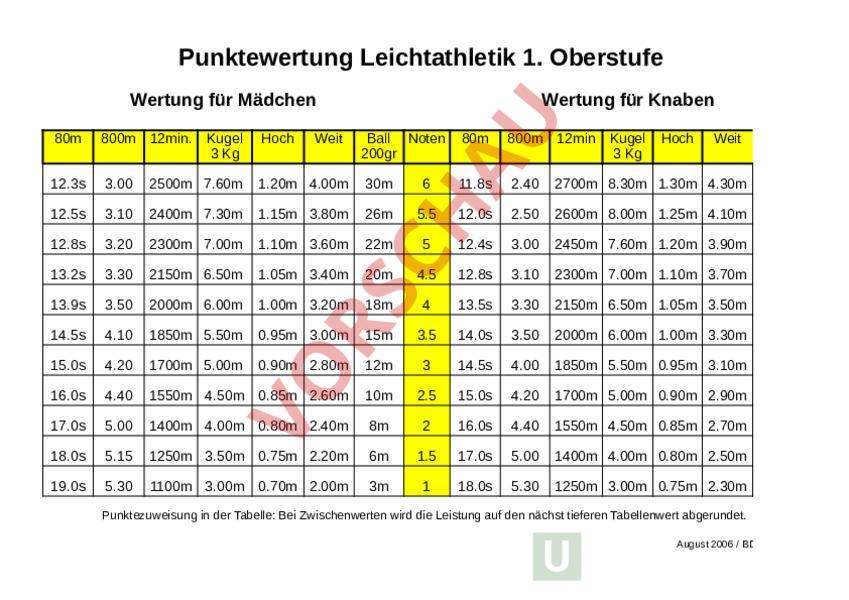 Arbeitsblatt: Leichtathletik - Benotungstabelle