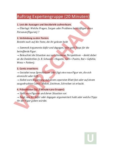 Auftrag Expertengruppe (20 Minuten) 1. Lest die Aussagen und Steckbriefe aufmerksam. Überlegt: Welche Fragen, Sorgen oder Probleme beschäftigen diese Personen(Figuren) 2. Verbindung zu den Texten: Bezieht euch auf die Texte, die ihr gelesen habt Sammelt Argumente dafür und dagegen, oder gebt Tipps für die betreffende Figur. Beleuchtet die Situation aus verschiedenen Perspektiven – denkt dabei an die Denkbrillen (z. B. Schwarz Negativ, Gelb Positiv, Rot Gefühle, Weiss Fakten). 3. Comic erweitern: Gestaltet neue Sprechblasen oder fügt eine neue Figur ein, die sich einmischt oder hilft. Haltet eure Ergänzung auf einem separaten Blatt fest oder auf einem ausgedruckten Comic. Kleben, Zeichnen, Schreiben ist erlaubt. 4. Präsentation (ca. 3 Minuten pro Gruppe): Stellt eure Figuren und deren Situation vor. Zeigt, wie ihr dafür oder dagegen argumentiert habt oder welche Tipps ihr der Figur geben würdet. Wenn man nicht mit KI arbeitet, arbeitet man bald gar nicht mehr. Seit die Sensoren mir die Tierdaten schicken, kann ich endlich besser planen – und schlafe auch mal aus. Ich habe 40 Jahre ohne diesen ganzen Digital-Kram gearbeitet – das schaffen wir auch weiter. Digitalisierung macht meine Arbeit schneller – aber die besten Ideen kommen immer noch von Menschen! Wenn Roboter bald alles machen – braucht es dann überhaupt noch Menschen? Nina, 14 Schülerin, interessiert sich für soziale Berufe (z. B. Pflege, Betreuung) Jan, 25 KV-Angestellter, arbeitet oft im Homeoffice, digital organisiert Lena, 35 Landwirtin, führt einen Betrieb mit digitaler Technik Herr Bolliger, 61 Angestellter im Büro, arbeitet noch analog – bald pensioniert Lina, 23 Mediamatikerin EFZ, arbeitet digital, kreativ im Co-Working-Space Ich sehe so viele offene Stellen, aber habe trotzdem keinen Job. Warum? Sandro (20), sucht Arbeit, nach der Lehre noch ohne Stelle Mein Vater sagt, wir sollen froh sein, überhaupt einen Job zu haben. Mira (18) lebt noch zu Hause, arbeitet in einem Restaurant Klar verändert sich alles – aber wer flexibel bleibt, findet immer was. Noah (25), Hat sich weitergebildet, sieht Chancen im Wandel Trotz gleicher Ausbildung hat meine Kollegin schneller ihre Wunschstelle bekommen – warum nicht ich? Lina (22), hat eine Berufsausbildung abgeschlossen und arbeitet momentan in einer Stelle, die nicht zu ihren Interessen passt. Wer lange arbeitslos ist, ist einfach faul. Herr Gerber (56) Langjährige Berufserfahrung Mein Vater sagt: Such dir was Sicheres, egal obs dir gefällt. Ich wollte nur schnell irgendwas finden – jetzt merke ich, der Beruf passt gar nicht zu mir. Soll ich die Lehre abbrechen? Die Uniform sah cool aus – aber in der Lehre ist alles ganz anders, als ich dachte. Ich weiss noch gar nicht, was ich mal machen will – aber der Druck ist voll hoch. Noah (14) Noch unentschlossen, interessiert an Technik. Alina (15) Schülerin, wird von zuhause bei der Berufswahl unterstützt. Leon (17) Macht eine KVLehre, findet die Arbeit aber oft langweilig. Dilan (18) Wollte Feuerwehrmann werden, merkt aber, wie anstrengend und fordernd der Beruf wirklich ist. Alle reden vom Lohn. Aber was, wenn ich etwas Sinnvolles machen will? Sara (17) Kann gut Mathe, würde aber am liebsten sich sozial engagieren.