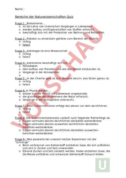 Arbeitsblatt: Bereiche der Naturwissenschaften Quiz