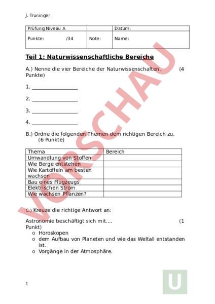 Arbeitsblatt: Prüfung Naturwissenschaftliches Erkunden