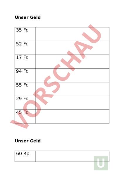 Unser Geld 35 Fr. 52 Fr. 17 Fr. 94 Fr. 55 Fr. 29 Fr. 45 Fr. Unser Geld 60 Rp. 50 Rp. 25 Rp. 75 Rp. 90 Rp. 10 Rp. 85 Rp. Unser Geld (nur Münzen verwenden) 10 Fr. 8 Fr. 5 Fr. 5 Fr. 3 Fr. 50 Rp. 5 Fr. 60 Rp. 2 Fr. 60 Rp.