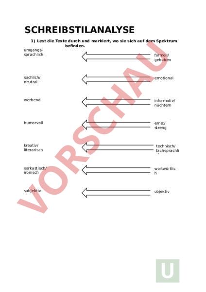 SCHREIBSTILANALYSE 1) Lest die Texte durch und markiert, wo sie sich auf dem Spektrum befinden. umgangssprachlich formell/ gehoben sachlich/ neutral emotional werbend informativ/ nüchtern humorvoll ernst/ streng kreativ/ literarisch technisch/ fachsprachli ch sarkastisch/ ironisch wortwörtlic subjektiv objektiv 2) Wählt nun zwei Texte, die sich stark unterscheiden. Beurteile folgende Kriterien. Text: Wortwahl Satzbau Ton/Atmosphäre Wirkung auf den Leser Text: Text 1 Das Guggershörnli ist ein beliebter Aussichtspunkt in der Region und liegt auf rund 1.283 Metern Höhe. Der gut ausgebaute Wanderweg führt in etwa 45 bis 60 Minuten vom Parkplatz bis zum Gipfel. Von dort aus bietet sich ein weiter Blick über das Emmental und die umliegenden Hügelketten. Am Gipfel befindet sich eine kleine Plattform mit Sitzgelegenheiten. Das Guggershörnli wird besonders an Wochenenden häufig besucht, da die Strecke auch für weniger geübte Wanderinnen und Wanderer gut geeignet ist. Text 2 Kennst du eigentlich das Guggershörnli? Das ist dieser Hügel da oben über dem Emmental, von dem man eine mega Aussicht hat. Der Weg hoch ist nicht schwer – in ner knappen Stunde bist du oben. Und ganz ehrlich: Der Blick lohnt sich komplett! Man sieht gefühlt die halbe Welt. Oben gibts sogar ein paar Bänkli zum Chillen. Perfekt für einen kurzen Ausflug, wenn man mal raus muss oder einfach gute Fotos haben will. Text 3 Entdecke das Guggershörnli – eines der schönsten Ausflugsziele der Region! Ein gut begehbarer Wanderweg führt dich in weniger als einer Stunde auf den Gipfel. Oben erwartet dich ein atemberaubender Rundblick über das Emmental und die grüne Hügellandschaft. Geniesse die Ruhe, mache unvergessliche Fotos oder entspanne auf den Sitzgelegenheiten am Aussichtspunkt. Das Guggershörnli: ideal für Familien, Gruppen und alle, die Natur erleben möchten. Starte dein nächstes Abenteuer jetzt! Text 4 Am vergangenen Wochenende zog das Guggershörnli erneut zahlreiche Besucherinnen und Besucher an. Der beliebte Aussichtspunkt im Emmental ist bekannt für seinen unkomplizierten Aufstieg und die weite Sicht über die Region. Laut Angaben des örtlichen Tourismusvereins wurde der Wanderweg zuletzt erweitert und mit zusätzlichen Wegweisern versehen. Viele Familien nutzten das sonnige Wetter für einen Ausflug auf den rund 1.283 Meter hohen Hügel. Die Rückmeldungen fielen überwiegend positiv aus. Text 5 Das Guggershörnli ist vermutlich der einzige Hügel, der sich selbst für einen Berg hält – und vielleicht hat er sogar recht. Nach einer kurzen Wanderung, die nicht mal richtig anstrengend ist, steht man oben und fragt sich, ob man nicht versehentlich im Flugzeug gelandet ist: Die Aussicht ist nämlich so gut. Die Bänkli am Gipfel wirken, als hätten sie schon hunderte Wanderer davor bewahrt, vor Begeisterung umzukippen. Ein perfekter Ort, um kurz so zu tun, als wäre man ein echter Profialpinist. Text 6 Als wir den Wald verliessen, lag das Guggershörnli vor uns, hell vom Morgenlicht angeleuchtet. Der Weg zog sich wie ein schmaler Faden den Hang hinauf, und jeder Schritt brachte uns höher in die Stille der Emmentaler Landschaft. Oben wehte ein sanfter Wind, und vor uns öffnete sich ein Panorama, das wir so nicht erwartet hatten. Die Hügel lagen wie grüne Wellen unter dem Himmel. Wir setzten uns auf eine der Bänke, und für einen Moment schien die Zeit stillzustehen. Text 7 Natürlich, das Guggershörnli – die ultimative Herausforderung für alle, die sich als „Bergsteiger fühlen wollen, ohne dafür tatsächlich ins Schwitzen zu geraten. Der Weg ist so leicht, dass selbst meine Oma ihn schneller hochläuft als ich. Oben gibts dann eine Aussicht, die so schön ist, dass man fast vergisst, wie kurz die Wanderung war. Ein paar Bänkli stehen auch rum, falls der „anstrengende Aufstieg doch Spuren hinterlassen hat. Ideal für alle, die gerne Abenteuer posten, aber keine erleben wollen. Text 8 Es war einmal ein kleiner Hügel im Emmental, den die Menschen das Guggershörnli nannten. Auf seinem Gipfel lebte eine geheimnisvolle Hüterin, die darüber wachte, dass die Natur in Frieden blieb. Eines Tages verirrte sich ein junger Hirtenjunge im dichten Nebel. Als er fast aufgeben wollte, erschien ein kleiner silberner Fuchs und führte ihn den Hang hinauf. Oben wartete die Hüterin bereits auf ihn. „Wer den Mut hat, den Weg zu mir zu finden, sieht die Welt klarer, sagte sie und zeigte ihm die weite Aussicht über die Hügel. Als der Junge wieder hinabstieg, war der Nebel verschwunden – und seitdem erzählt man sich, dass das Guggershörnli jedem Mut schenkt, der es erklimmt.