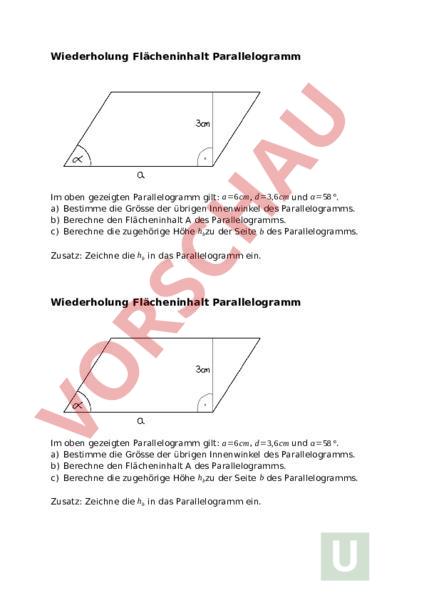 Wiederholung Flächeninhalt Parallelogramm Im oben gezeigten Parallelogramm gilt: a6 cm, d3,6 cm und 58 . a) Bestimme die Grösse der übrigen Innenwinkel des Parallelogramms. b) Berechne den Flächeninhalt des Parallelogramms. c) Berechne die zugehörige Höhe hb zu der Seite des Parallelogramms. Zusatz: Zeichne die hb in das Parallelogramm ein. Wiederholung Flächeninhalt Parallelogramm Im oben gezeigten Parallelogramm gilt: a6 cm, d3,6 cm und 58 . a) Bestimme die Grösse der übrigen Innenwinkel des Parallelogramms. b) Berechne den Flächeninhalt des Parallelogramms. c) Berechne die zugehörige Höhe hb zu der Seite des Parallelogramms. Zusatz: Zeichne die hb in das Parallelogramm ein.