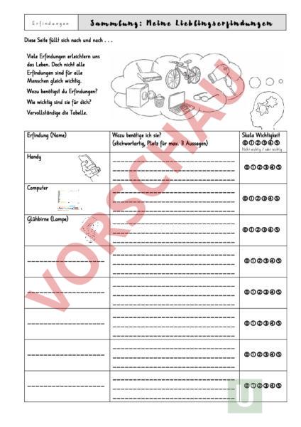 Erfindungen Sammlung: Meine Lieblingserfindungen Diese Seite füllt sich nach und nach . Viele Erfindungen erleichtern uns das Leben. Doch nicht alle Erfindungen sind für alle Menschen gleich wichtig. Wozu benötigst du Erfindungen? Wie wichtig sind sie für dich? Vervollständige die Tabelle. Erfindung (Name) Wozu benötige ich sie? (stichwortartig, Platz für max. 3 Aussagen) Skala Wichtigkeit Nicht wichtig sehr wichtig Handy Computer Glühbirne (Lampe)