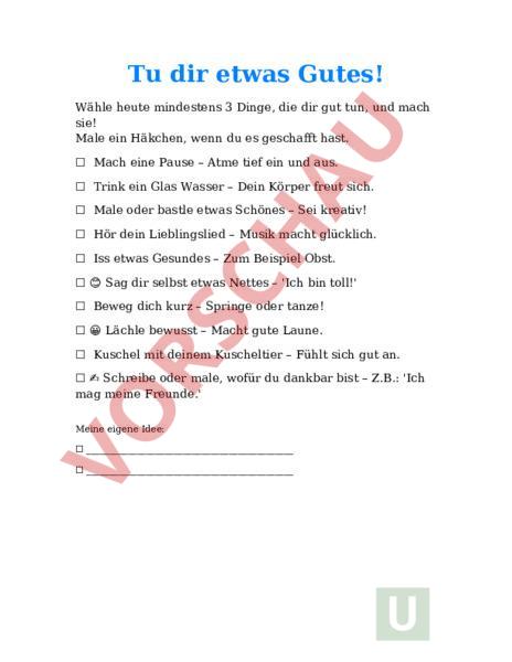 Tu dir etwas Gutes! Wähle heute mindestens 3 Dinge, die dir gut tun, und mach sie! Male ein Häkchen, wenn du es geschafft hast. Mach eine Pause – Atme tief ein und aus. Trink ein Glas Wasser – Dein Körper freut sich. Male oder bastle etwas Schönes – Sei kreativ! Hör dein Lieblingslied – Musik macht glücklich. Iss etwas Gesundes – Zum Beispiel Obst.