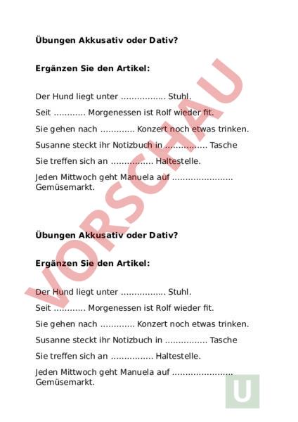 Übungen Akkusativ oder Dativ? Ergänzen Sie den Artikel: Der Hund liegt unter Stuhl. Seit Morgenessen ist Rolf wieder fit. Sie gehen nach . Konzert noch etwas trinken. Susanne steckt ihr Notizbuch in . Tasche Sie treffen sich an . Haltestelle. Jeden Mittwoch geht Manuela auf Gemüsemarkt. Übungen Akkusativ oder Dativ? Ergänzen Sie den Artikel: Der Hund liegt unter Stuhl. Seit Morgenessen ist Rolf wieder fit. Sie gehen nach . Konzert noch etwas trinken. Susanne steckt ihr Notizbuch in . Tasche Sie treffen sich an . Haltestelle. Jeden Mittwoch geht Manuela auf Gemüsemarkt.