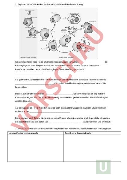 1. Ergänze die im Text fehlenden Fachausdrücke mithilfe der Abbildung. Wenn Krankheitserreger in den Körper eindringen, dann versuchen die Eindringlinge zu verschlingen. Außerdem informieren sie eine andere Gruppe der weißen Blutkörperchen über die Art der Eindringlinge. Diese Meldung geht an die. Sie geben den „Einsatzbefehl für zwei Formen der Infektabwehr: Einerseits informieren sie die , die zu den Krankheitserregern passende Abwehrstoffe herzustellen. Diese Abwehrstoffe nennt man. Diese verbinden sich eng mit den Krankheitserregern, die durch die Verbindung unschädlich gemacht werden. Die Verbindungen werden dann von . Auf die Signale der T-Helferzellen hin wird noch eine andere Gruppe von weißen Blutkörperchen mobilisiert: die Diese suchen nach Zellen, die bereits von den Erregern befallen worden sind. Anschließend werden die abgetöteten kranken Zellen vonaufgenommen und „verdaut. 2. Erkläre den Unterschied zwischen der unspezifischen Abwehr und dem spezifischen Immunsystem. Unspezifische Immunabwehr Spezifische Immunabwehr 3. Nenne die unterschiedlichen Schutzbarrieren unseres Körpers. 4. Beschreibe grob (in Stichworten) was bei den Schritten 2-6 geschieht. Verwende für alle Zellen die richtigen Namen (z.B. T-Helferzelle). 1 ----------------------------------------------------------------------------------------------------------------------2 ----------------------------------------------------------------------------------------------------------------------3 ----------------------------------------------------------------------------------------------------------------------4 ----------------------------------------------------------------------------------------------------------------------5 ----------------------------------------------------------------------------------------------------------------------- 6 ----------------------------------------------------------------------------------------------------------------------5. Wie gelangen Viren, Bakterien und andere Krankheitserreger in den Körper? 6. Welche Organe gehören zum Abwehrsystem des Körpers? 7. Wofür steht die Abkürzung „WHO? 8. Wann ist ein Mensch laut „WHO gesund? 9. Stelle in einer Tabelle die Organe dar, welche Funktionen die Organe des Immunsystems bei dessen Arbeit übernehmen. Organ Knochenmark Milz Lymphknoten Thymus Mandeln Funktion im Immunsystem 10. Was bedeutet «immun»? 11. Was ist das Immunsystem? Kurzfristige körperliche Reaktionen Reaktion Folge Beschreibung Reaktion Folge Beschreibung Langfristige Folgen bei Dauerstress Reaktion Folge Beschreibung Stressreaktion Bei Stress werden Adrenalin, Noradrenalin und Cortisol ausgeschüttet. : sorgen für eine schnelle Reaktion – Herzschlag, Blutdruck und Blutzucker steigen. : folgt kurz darauf, um die Energiespeichern für den Körper bereitzustellen und das Gleichgewicht wiederherzustellen. Diese stressbedingte Reaktion ist ein grundlegender, der sich im Laufe der Evolution entwickelt hat. Sie zeigt, wie der Körper auf unmittelbare Bedrohungen reagiert – indem er uns auf Kampf oder Flucht vorbereitet.Körperliche Reaktionen bei Stress Bei Stress verändert sich der ganze Körper: So reagiert der Körper auf Stress? Nr. Körperteil 1 Augen 2 Haut 3 Bronchien 4 Herz 5 Blut 6 Blutdruck, Puls 7 Muskeln 8 Nebenniere 9 Immunsystem 10 Darm Reaktion auf Stress Betrachte die Abbildungen. 1) Bestimme normalen Stresses und Dauerstress. 2)Erläutere den Unterschied zwischen dem Ablauf des normalen Stresses und dem des Dauerstresses. Prüfung: Das Immunsystem – Aufbau, Abwehr und Immunreaktionen 1. Nenne drei Krankheitserreger, mit denen Menschen im Alltag in Kontakt kommen können. . 2. Erkläre die zwei großen Bereiche des Immunsystems: angeborene und erworbene Abwehr. angeborene Abwehr erworbene Abwehr 3. Ordne die Begriffe zu (Fresszelle, Antigen, Antikörper, Erreger). a) Wird vom Immunsystem als fremd erkannt: b) Wird von Plasmazellen gebildet: c) Verdaut Krankheitserreger: d) Dringt in den Körper ein und verursacht Krankheiten: 4. Fülle die Tabelle aus. Zelltyp Aufgabe Fresszelle T-Helferzelle Plasmazelle Killerzelle Gedächtniszelle 5. Erkläre das Schlüssel-Schloss-Prinzip am Beispiel von Antigen und Antikörper. 6. Erkläre, was Antigene sind und warum sie für das Immunsystem wichtig sind. . 7. Nenne zwei Beispiele aus dem Alltag, bei denen Gedächtniszellen besonders wichtig sind. Die vier Phasen der akuten Stressreaktion 1. Beschrifte die Abbildung. Trage die jeweilige Phase in die Textbox ein. 1. Vorphase: Gelassenheit 2. Alarmphase 3. Handlungsphase 4. Erholungsphase 2. Was passiert, wenn der Stress länger anhält? Welche Symptome (Anzeichen). 3. Beschreibe, warum Stress positiv für uns sein kann. Erkläre dies an einem Beispiel. 4. Was hilft Stress abzubauen? Verbinde die Aktivitäten miteinander. 5. Wissensfragen (Kurzantwort) 1. Nenne Situationen, in denen Stress im Alltag auftreten kann. 2. Welche zwei schnellen Stresshormone werden im Nebennierenmark ausgeschüttet? 3. Welches Hormon wird bei längerem Stress ausgeschüttet und wo entsteht es? 4. Was bedeutet „Kampf oder Flucht-Reaktion? . 5. Welcher Teil des Nervensystems aktiviert den Körper im Stressmoment? 6. Welcher Teil des Nervensystems beruhigt den Körper nach Stress? 6. Erkläre in eigenen Worten 1. Warum ist Cortisol kurzfristig nützlich, langfristig aber schädlich? . 2. Erkläre, warum man bei Stress kalte Hände bekommt. . 3. Warum ist es sinnvoll, dass das Verdauungssystem im Stressmodus „herunterfährt? . 7. Bonus – für eine 6