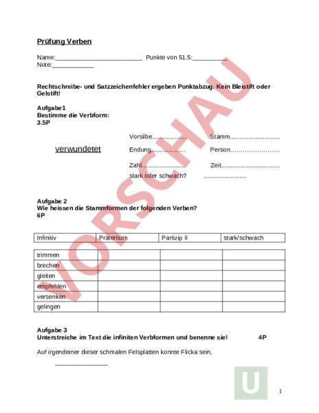 Prüfung Verben Name:_ Punkte von 51.5: Note: Rechtschreibe- und Satzzeichenfehler ergeben Punktabzug. Kein Bleistift oder Gelstift! Aufgabe1 Bestimme die Verbform: 3.5P verwundetet Vorsilbe Stamm. Endung Person Zahl. Zeit stark oder schwach? . Aufgabe 2 Wie heissen die Stammformen der folgenden Verben? 6P Infinitiv Präteritum Partizip II stark/schwach trimmen brechen gleiten empfehlen versenken gelingen Aufgabe 3 Unterstreiche im Text die infiniten Verbformen und benenne sie! 4P Auf irgendeiner dieser schmalen Felsplatten konnte Flicka sein, 1 oder sie hatte sich in einer der kleinen Schluchten versteckt, die am Fusse der Klippen lagen. Eben hatte es zu regnen begonnen. Sich schnell umsehend, suchte er einen Unterstand. Aufgabe 4 Entscheide bei den folgenden Partizipien, ob es sich um Vorsilben oder um Verbzusätze handelt. Kennzeichne sie mit den Abkürzungen VO (Vorsilbe) oder VZ (Verbzusatz) .5P entfernen verstellen Umfallen zerhacken durchhalten zerschlagen befehlen ablehnen durchgefahren entschädigen Aufgabe 5 Vorzeitigkeit und Gleichzeitigkeit. Setze die Verben in die richtige Zeitform und gib an, ob es sich um vorzeitige Geschehnisse oder gleichzeitige handelt. 5P 1. Das kleine Schwesterchen (giessen) seinen Kakao über die Zeichnung, die Hans eben (beenden). 2. Die Mutter (müssen) Fritzchen von Kopf bis Fuss frisch anziehen, denn der arme Kerl (fallen) in eine Pfütze. 3. Die Katze (auffressen) den feinen Schinken, den wir für unsere Gäste (kaufen). 4. Zu spät (bemerken) Annemarie, dass sie (sich setzen) in einen Ameisenhaufen. 2 5. Der Sechser im Lotto (nützen) dem Vater nichts, weil Peter den Zettel nicht am Kiosk (einzahlen). Aufgabe 6 Bestimme die Zeit .6P a) Gestern schrieb ich einen Bericht. b) Ihr werdet dieses Wort bestimmt finden. . c) Wer hat sein Heft noch nicht abgegeben? d) Kommt her zu mir! . e) Er wird die Wörter nicht gelernt haben. . f) Er hatte ihm eine Ohrfeige gegeben. . Aufgabe 7 Kennzeichne die Personalformen und infiniten Verben unterschiedlich! 14P (Auch die Hilfsverben und Modalverben unterstreichen und speziell kennzeichnen. Vergiss die Verbzusätze nicht!) Die beiden Jungen flohen dem Städtchen zu, sprachlos vor Entsetzen. Von Zeit zu Zeit warfen sie einen Blick über die Schulter zurück, als ob sie fürchteten, dass man sie verfolgte. Jeder Baumstumpf, der vor ihnen auftauchte, schien ihnen ein Mensch und ein Feind zu sein und raubte ihnen fast den Atem, und als sie an einigen allein 3 liegenden Hütten vorüberjagten, schien das Bellen der aufgestörten Hofhunde ihren Füssen Flügel zu verleihen. „Wenn wir nur die alte Gerberei erreichen, ehe wir zusammenbrechen, keuchte Tom in kurzen Stössen zwischen den Atemzügen, „ich kann kaum mehr! – Huckleberrys schweres Schnaufen war die einzige Antwort. Sie spannten ihre letzte Kraft an, und schliesslich stürzten sie durch eine offene Tür und fielen erschöpft und erleichtert in den Schatten auf dem Boden. Als sich Toms Puls beruhigt hatte, flüsterte er: „Huck, was denkst du, was wird daraus werden? 4 Aufgabe 8 Bei folgenden Verben ändert sich die Bedeutung, wenn sie stark oder schwach sind. Zeige das mit Beispielsätzen im Präteritum oder Perfekt. Verben: erschrecken/ wachsen/ schleifen 6P 5