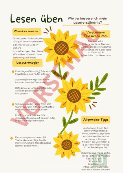 Lesen üben Wortschatz erweitern Gezielt lernen: Vokabeln, die häufig in Texten vorkommen (z. B. Wörter wie „jedoch, „daher). Kontextbezogen üben: Neue Wörter durch Lesen in ihrer Bedeutung verstehen. Wie verbessere ich mein Leseverständnis? Verschiedene Textsorten lesen Themenvielfalt: Unterschiedliche Themen wählen, um das Verständnis für verschiedene Sprachstile zu fördern (z. B. journalistisch vs. literarisch). Lesestrategien Überfliegen (Skimming): Schnell die Hauptidee eines Textes erfassen. Scannen (Scanning): Spezifische Informationen im Text finden. Detailanalyse: Einzelne Sätze oder Absätze genau lesen und analysieren. W-Fragen stellen: Wer? Was? Wo? Wann? Warum? hilft, die wichtigsten Informationen herauszufiltern. Kurzfassung schreiben: Eine Zusammenfassung auf Deutsch oder in der Fremdsprache üben. Kernaussagen markieren: Mit Textmarkern wichtige Punkte markieren, um die Hauptaussage leichter zu erkennen. Allgemeine Tipps Audiobooks: Einen Text lesen und gleichzeitig hören, um die Aussprache und das Verständnis zu verbessern. Dialoge: Mitlesen bei Untertiteln (z. B. bei Filmen oder Videos in der Fremdsprache). Regelmässige Praxis: Selbst kurze Texte (10-15 Minuten täglich) sorgen für Fortschritte. Lesetagebuch: Interessante Ausdrücke oder neue Wörter notieren. Les vacances de Sophie Sophie adore voyager. Lannée dernière, elle est allée en Italie avec ses amis. Ils ont visité Rome, Florence et Venise. À Rome, ils ont vu le Colisée et mangé de délicieuses pizzas. À Florence, Sophie acheté un tableau pour ses parents. À Venise, ils ont fait une promenade en gondole. Elle se souvient de ce voyage comme lun des meilleurs moments de sa vie. Übungen: W-Fragen a) Où Sophie est-elle allée lannée dernière? b) Quest-ce quelle vu à Rome? c) Pour qui Sophie a-t-elle acheté un tableau? Richtig oder falsch? a) Sophie visité trois villes en Italie. b) À Venise, elle mangé des pizzas. c) Elle acheté un cadeau pour ses amis. Zusammenfassung Écris une phrase pour résumer le voyage de Sophie. La journée de Paul Paul se lève toujours à 6 heures pour aller courir. Après sa course, il prend une douche et prépare un café. Ensuite, il travaille de 8 heures à 16 heures comme infirmier à lhôpital. Pendant sa pause déjeuner, il lit souvent un livre ou écoute de la musique. Le soir, Paul aime regarder des séries ou cuisiner un nouveau plat. Lückentext Complète avec les mots suivants: lit, infirmier, cuisiner, 6 heures, série. a) Paul se lève à . b) Il travaille comme . c) Pendant sa pause déjeuner, il un livre. d) Le soir, il aime regarder une . e) Paul aime de nouveaux plats. Fragen zum Text a) Quelle est la profession de Paul? b) Que fait-il après sa course? c) Que fait-il pendant sa pause déjeuner? Une décision importante Marie décidé de changer de travail. Elle était enseignante dans une école primaire, mais elle voulait un nouveau défi. Après plusieurs mois de réflexion, elle choisi de travailler dans une entreprise comme formatrice. Elle adore aider les adultes à apprendre de nouvelles compétences. Bien que ce soit difficile au début, elle est très heureuse de sa décision. Richtig oder falsch? a) Marie travaille toujours dans une école primaire. b) Elle réfléchi pendant des semaines avant de prendre sa décision. c) Elle est contente de son nouveau travail. Wortschatz-Fragen a) Trouve un synonyme pour «choisir». b) Explique le mot «formateur» en français. Diskussionsfrage Que feriez-vous si vous vouliez changer de travail?