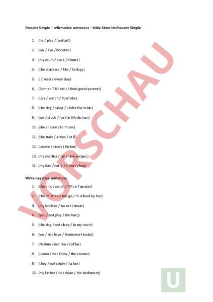 Present Simple – affirmative sentences – bilde Sätze im Present Simple 1. (he play football) 2. (we live Böckten) 3. (my mum cook dinner) 4. (the students like Biology) 5. (I read every day) 6. (Tom an Till visit their grandparents) 7. (Lisa watch YouTube) 8. (the dog sleep under the table) 9. (we study for the Maths test) 10. (she listen to music) 11. (the train arrive at 8) 12. (Leonie study Italian) 13. (my mother try new recipes) 14. (my dad carry a heavy bag) Write negative sentences 1. (she not watch TV on Tuesday) 2. (the children not go to school by bus) 3. (my brother no eat meat) 4. (you not play the harp) 5. (the dog not sleep in my room) 6. (we not have homework today) 7. (Nadine not like coffee) 8. (Luana not know the answer) 9. (they not study Italian) 10. (my father not clean the bathroom) 11. (the shop not open on Sundays) 12. (the children not eat vegetables) Ask questions by using the Present Simple 1. (you like tea?) 2. (he speak Spanish?) 3. (they live near here?) 4. (your sister play football?) 5. (the English lessen start at 07:30?) 6. (he read books?) 7. (he know the answer?) 8. (you want help?) 9. (when you start school?) 10. (when the train leave?) 11. (why you like horror films?) 12. (how old be Luna?) Describe your best friend by writing at least 6 sentences. Use at least 2 negative sentences. 1. 2. 3. 4. 5. 6. 7. 8.