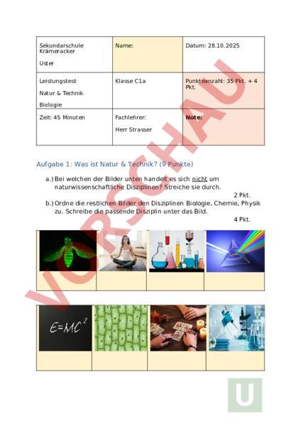 Sekundarschule Krämeracker Name: Datum: 28.10.2025 Klasse C1a Punkteanzahl: 35 Pkt. 4 Pkt. Fachlehrer: Note: Uster Leistungstest Natur Technik Biologie Zeit: 45 Minuten Herr Strasser Aufgabe 1: Was ist Natur Technik? (9 Punkte) a.) Bei welchen der Bilder unten handelt es sich nicht um naturwissenschaftliche Disziplinen? Streiche sie durch. 2 Pkt. b.) Ordne die restlichen Bilder den Disziplinen Biologie, Chemie, Physik zu. Schreibe die passende Disziplin unter das Bild. 4 Pkt. c) Was ist Biologie? Erkläre in 2-3 Sätzen! HILFESTELLUNG Diese Fachbegriffe helfen dir dabei. Leben, Tiere, Menschen, Pflanzen, Wissenschaft 3 Pkt. Aufgabe 2: Experimentierprozess (4 Punkte) a) Bringe die Schritte des Experimentierprozesses in die richtige Reihenfolge! 4 Pkt. Teilschritt Auswerten Planen Darstellen Vermuten Fragen Weiterden ken Durchführe Berichten 2 Nummer 3 Aufgabe 3: Benenne und verwende ein Mikroskop (13 Punkte) a) Beschrifte in der Abbildung 6 Mikroskop Bestandteile 8 Pkt. b) Zeichne die Zwiebelzellen, die du im Unterricht mikroskopiert hast. Beschrifte die Zeichnung mit 3 Begriffe der Zellen. HILFESTELLUNG: Erinnere dich an das Foto, das du von den Zellen im Unterricht gemacht hast. Benenne 3 Teilen der Zelle wie die Wand oder den Kern in der Mitte. 4 5 Pkt. 5 Aufgabe 4: Wie funktioniert ein Mikroskop? (4 Punkte) a) Notiere eine Lösung für folgendes Problem. Anna sieht nur ein dunkles Bild unter dem Mikroskop. Erkläre zwei Abläufe, die sie möglicherweise beim Mikroskopieren falsch gemacht hat. 2 Pkt. b) Erkläre in 2-3 Sätzen und skizziere, wie die Vergrösserung in einem Mikroskop mit 2 Linsen funktioniert. Skizze: 6 2 Pkt. Aufgabe 5: Zellen (5 Punkte) a.) Was passiert, wenn du Salzwasser zu den Zwiebelzellen gibst? 2 Pkt. b.) Beurteile: ist folgende Aussage richtig oder falsch? Begründe deine Entscheidung! 2 Pkt. Auch wir Menschen haben Zellen in unserem Körper. Richtig Falsch Begründung: c) Beurteile: ist folgende Aussage richtig oder falsch? 1 Pkt. «Alle Wissenschaften (Biologie, Geschichte, Theologie, BWL, Chemie,) sind Naturwissenschaften.» 7 Richtig 8 Falsch Bonus Aufgaben: Zufallserfindung (4 Punkte) a) Beschrifte die Zeichnung. 2 Pkt. b) Was ist Penicillin? 1 Pkt. c) Welche 2 Vorteile bringt uns die Erfindung des Penicillins? 1 Pkt.