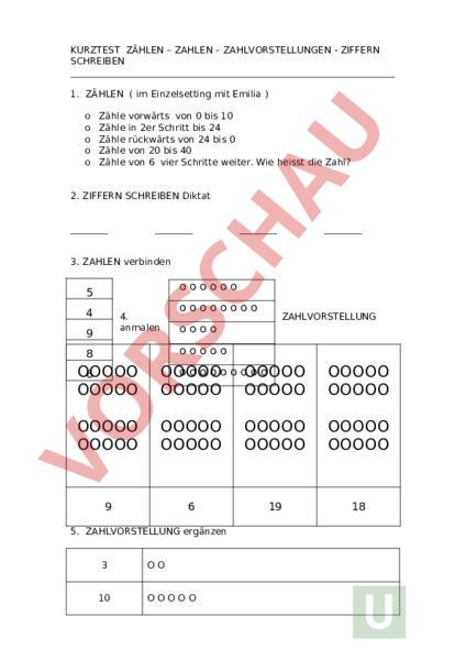 KURZTEST ZÄHLEN – ZAHLEN – ZAHLVORSTELLUNGEN ZIFFERN SCHREIBEN 1. ZÄHLEN im Einzelsetting mit Emilia o o o Zähle Zähle Zähle Zähle Zähle vorwärts von 0 bis 10 in 2er Schritt bis 24 rückwärts von 24 bis 0 von 20 bis 40 von 6 vier Schritte weiter. Wie heisst die Zahl? 2. ZIFFERN SCHREIBEN Diktat 3. ZAHLEN verbinden oooooo 5 4 oooooooo 4. anmalen 9 ZAHLVORSTELLUNG oooo ooooo 8 OOOOO 6 OOOOO o o o oOOOOO oo OOOOO OOOOO OOOOO OOOOO OOOOO OOOOO OOOOO OOOOO OOOOO OOOOO OOOOO OOOOO OOOOO 9 6 19 18 5. ZAHLVORSTELLUNG ergänzen 3 10 OO OOOOO 10 OOO 15 OOOOO OOOOO 6. ZAHLVORSTELLUNG schreiben OOOOO OOOOO OOOOO OOOOO OOOOO OOOOO OOOOO OOOOO OOOOO OOOOO OOOOO OOOOO OOOOO OOOOO OOOOO OOOOO *** 7. ZAHLEN SCHREIBEN aufreihen 2 15 16 4 8 20 22