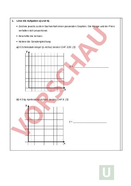 1. Löse die Aufgaben a) und b). Zeichne jeweils zu dem Sachverhalt einen passenden Graphen. Die Menge und der Preis verhalten sich proportional. Beschrifte die Achsen. Notiere die Geradengleichung a) 6 Schokoladenriegel (y-Achse) kosten CHF 3.00. (3) b) 4.5 kg Aprikosen(y-Achse) kosten CHF 8. (3) 2. Löse die Aufgaben a) – e): a) Bestimme die Geradengleichung. (2) b) Zeichne den Graphen zu der Geradengleichung. (2) c) Zeichne eine Gerade mit Steigung 2 durch den Punkt (3/-2). (2) -0.3x 4 d) Berechne die fehlenden Werte in der Wertetabelle zu der Gleichung 0.15x – 4. (2) y 3 -19 7 e) Bei welchem Punkt schneidet die Gerade mit der Geradengleichung 0.15x – 4 die x-Achse? (2) Punkt: -25 3. Markiere alle Graphen, die einen gleichen Sachverhalt zeigen mit der gleichen Farbe. (6) 4. Nadja (n) hat ein neues Smartphone gekauft und dazu ein Abo abgeschlossen. Sie bezahlt dafür pro Monat CHF 35. Zusätzlich bezahlt sie pro Gesprächsminute CHF 0.09. Ihr Bruder Thomas (t) verzichtet auf ein Abo. Er bezahlt pro Gesprächsminute CHF 0.20. a) Zeichne beide Geraden (n) und (t) in das Koordinatensystem und beschrifte sie. (4) Kosten [CHF] 200 150 100 50 0 200 400 600 Gesprächsdauer [Minuten] b) Vervollständige die beiden Geradengleichungen. (4) Gerade n: Gerade t: c) Beide telefonieren im Monat August 250 Minuten. Wie viel bezahlen sie in diesem Monat? (2) Nadja: Thomas: d) Der Mobilfunkanbieter erlässt eine neue Flatrate für beide Angebote. Sobald sie 500 Minuten telefoniert haben, sind die weiteren Gesprächsminuten gratis. Wie hoch kann die Rechnung am Ende des Monates nun noch maximal sein? Markiere beide Punkte im Graphen und notiere die Werte unten. (2) Max. Rechnungsbetrag Nadja:, Max. Rechnungsbetrag Thomas: 5. Ein Mobilfunkanbieter hat ein neues Angebot: Kosten [CHF] 200 0 200 400 100 600 a) Erfinde dazu einen Werbetext, der das Angebot bewirbt. Benutze dazu mindestens 3 Informationen, die du aus dem Graphen ablesen kannst. (3) b) Wie sähe dein Lieblingsmobilfunkabo aus? (3) Zeichne deinen Graphen in das Koordinatensystem oben ein. Beschreibe, weshalb dieses Abo so gut ist. Gesprächsdauer [Minuten]