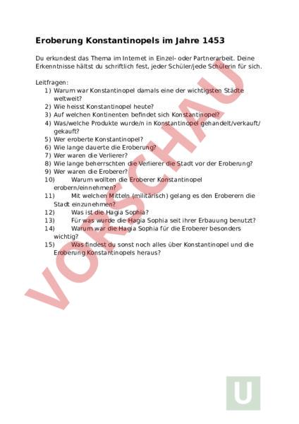 Eroberung Konstantinopels im Jahre 1453 Du erkundest das Thema im Internet in Einzel- oder Partnerarbeit. Deine Erkenntnisse hältst du schriftlich fest, jeder Schüler/jede Schülerin für sich. Leitfragen: 1) Warum war Konstantinopel damals eine der wichtigsten Städte weltweit? 2) Wie heisst Konstantinopel heute? 3) Auf welchen Kontinenten befindet sich Konstantinopel? 4) Was/welche Produkte wurde/n in Konstantinopel gehandelt/verkauft/ gekauft? 5) Wer eroberte Konstantinopel? 6) Wie lange dauerte die Eroberung? 7) Wer waren die Verlierer? 8) Wie lange beherrschten die Verlierer die Stadt vor der Eroberung? 9) Wer waren die Eroberer? 10) Warum wollten die Eroberer Konstantinopel erobern/einnehmen? 11) Mit welchen Mitteln (militärisch) gelang es den Eroberern die Stadt einzunehmen? 12) Was ist die Hagia Sophia? 13) Für was wurde die Hagia Sophia seit ihrer Erbauung benutzt? 14) Warum war die Hagia Sophia für die Eroberer besonders wichtig? 15) Was findest du sonst noch alles über Konstantinopel und die Eroberung Konstantinopels heraus? Konstantinopel im 15. Jahrhundert
