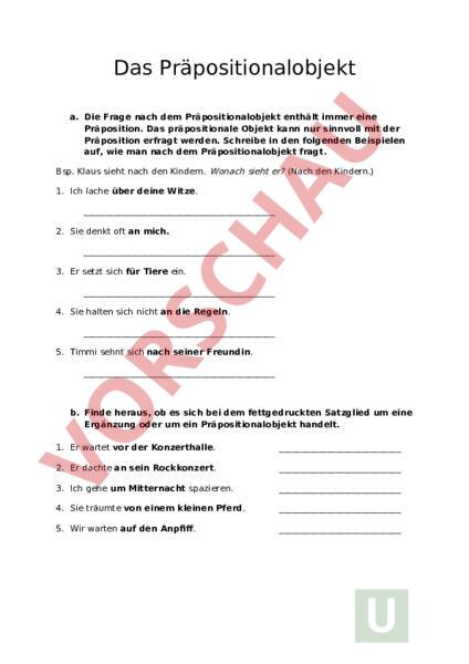 Das Präpositionalobjekt a. Die Frage nach dem Präpositionalobjekt enthält immer eine Präposition. Das präpositionale Objekt kann nur sinnvoll mit der Präposition erfragt werden. Schreibe in den folgenden Beispielen auf, wie man nach dem Präpositionalobjekt fragt. Bsp. Klaus sieht nach den Kindern. Wonach sieht er? (Nach den Kindern.) 1. Ich lache über deine Witze. 2. Sie denkt oft an mich. 3. Er setzt sich für Tiere ein. 4. Sie halten sich nicht an die Regeln. 5. Timmi sehnt sich nach seiner Freundin. b. Finde heraus, ob es sich bei dem fettgedruckten Satzglied um eine Ergänzung oder um ein Präpositionalobjekt handelt. 1. Er wartet vor der Konzerthalle. 2. Er dachte an sein Rockkonzert. 3. Ich gehe um Mitternacht spazieren. 4. Sie träumte von einem kleinen Pferd. 5. Wir warten auf den Anpfiff.