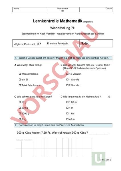 Name Mathematik 8H Datum Lernkontrolle Mathematik (angepasst) Wiederholung 7H Sachrechnen im Kopf, Verkehr – was ist verkehrt? und Grössen auf Schiffen Mögliche Punktzahl: 37 Erreichte Punktzahl: Note: 1. Welche Grösse passt am besten? Manchmal gibt es mehr als eine richtige Antwort. Was wiegt etwa 100 g? Wie viel Zeit braucht man zu Fuss für 1km? (1kmOS-Schulhaus bis zum Open-air) Wassermelone 15 Minuten ein Ei 1 Stunde Tafel Schokolade 2 Stunden Wie schwer etwa ist eine Katze? Wie lang etwa ist ein kleines Auto? 50 1,80 500 4m 5000 1 km 5 kg 40 /2 2. Sachrechnen im Kopf! Unten hast du Platz zum Ausrechnen 300 Käse kosten 7,20 Fr. Wie viel kosten 900 Käse? Seite 1 von 5 600 Birnen kosten 4,40 Fr. Wie viel kosten 150 Birnen? 1kg Tomaten kostet 4,20 Fr. Wie viel kosten 7 kg Tomaten? 200g Himbeeren kosten 7,50 Fr. Wie viel kosten 400 Himbeeren? 1 kg Orangen kostet Fr. 5.00. Wie viele kg Orangen können für 20 Fr. gekauft werden? Ein Zug fährt in Bern um 16.36 Uhr ab und kommt in Aarau um 17.12 Uhr an. Wie lange ist er unterwegs? /6 Seite 2 von 5 3.Sachaufgabe Leo kauft einen Orangensaft, eine Birne ein Brot mit Käse und ein Stück Kuchen. Sie hat Fr.3.60 bei sich. Wie viel Geld fehlen ihr? /1 4.Bestimme die Anzahl Strassentote der verschiedenen Länder. Trage in die Tabelle ein. Anzahl Strassentote je 1 Million Einwohner 90 Bulgarien 80 Lettland 70 60 Polen 50 Belgien 40 Irland 30 Finnland 20 Dänemark 10 Schweden 0 /4 Land Anzahl Strassentote Bulgarien Lettland Polen Belgien Irland Finnland Dänemark Schweden Seite 3 von 5 /4 5. Berechne das Alter der Schiffe heute (2024)! Schiff Ausrechnung Alter heute MS Bubenberg DS Lötschberg DS Blümlisalp MS Interlaken 6. In der Tabelle sieht man den Einsatz eines Schiffführers auf der «DS Blümlisalp». Berechne die Arbeitszeit pro Tag. Du kannst die Arbeitszeit mit Hilfe eines Rechenstrichs unten ausrechnen. Wochentag Arbeitszeit Montag 05:30 – 13:00 Dienstag 13:30 – 20:40 Donnerstag 13:30 – 20:50 Freitag 06:00 – 13:00 Samstag 05:30 – 13:30 Arbeitszeit /5 Seite 4 von 5 7.Runde die Ende 2023 zurückgelegten Strecken auf 100 km Gerundet auf 1000 km 10 000 km MS Bubenberg /8 100 000 km DS Lötschberg DS Blümlisalp MS Interlaken 100 km 1 000 km 10 000 km 100 000 km 8. Erstelle Ranglisten für Schreibe die Schiffsnamen in die leeren Kästchen die Geschwindigkeit (beginne mit dem schnellsten Schiff) das Fassungsvermögen (Anzahl Personen) die Motorenleistung (beginne mit dem stärksten Schiff) /4 die Länge über alles (beginne mit dem längsten Schiff) Geschwindigkeit Anz. Personen Leistung Länge 1 2 3 4 9. Suche die fehlenden Angaben und berechne jeweils die maximale Ladung! Unten hast du Platz zum Ausrechnen. Schiff Gewicht leer Gewicht beladen maximale Ladung MS Bubenberg DS Lötschberg /3 Seite 5 von 5