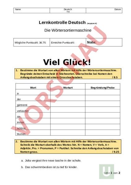Name Deutsch 7H Lernkontrolle Deutsch Datum (angepasst) Die Wörtersortiermaschine Mögliche Punktzahl: 36.75 Erreichte Punktzahl: Note: Viel Glück! 1. Bestimme die Wortart von allen Wörtern mit Hilfe der Wörtersortiermaschine. Begründe deinen Entscheid in Stichworten. Überschreibe bei Nomen den Anfangsbuchstaben mit einem Grossbuchstaben. 8.5 Wort Wortart Begründung/Probe in der gärtnerei verkaufen sie immer schöne blumen. 2. Bestimme die Wortart von allen Wörtern mit Hilfe der Wörtersortiermaschine. Schreib die Wortart oberhalb des Wortes hin. Nomen, Verb, Adjektiv, Pro. Pronomen, Partikel. Schreibe den Anfangsbuchstaben von Nomen gross. 9.25 a. Julia vergisst ihre neue tasche in der schule. b. Das schwimmbecken ist zu tief für kinder. Seite 1 von 2 c. Der helikopter stürzte auf das haus. d. Benjamin riecht den schlechten geruch des schmutzigen teppichs. 3. Bestimme die Wortart von allen Wörtern mit Hilfe der Wörtersortiermaschine. Unterstreiche jedes Wort mit der richtigen Farbe. 19 a. Er zerstörte einen teil des neuen zimmers. b. Peter arbeitet seit einer stunde still und konzentriert an seiner schönen zeichnung. c. Die fleissige büroarbeiterin öffnet bei kaltem wetter sofort die fenster. d. Die kinder bestellen ein feines dessert das sie mit grossem appetit essen. e. Wenn mira gute laune hat, dann singt sie laut ein fröhliches lied. f. Ich stelle den nassen regenschirm vor die türe. Seite 2 von 2