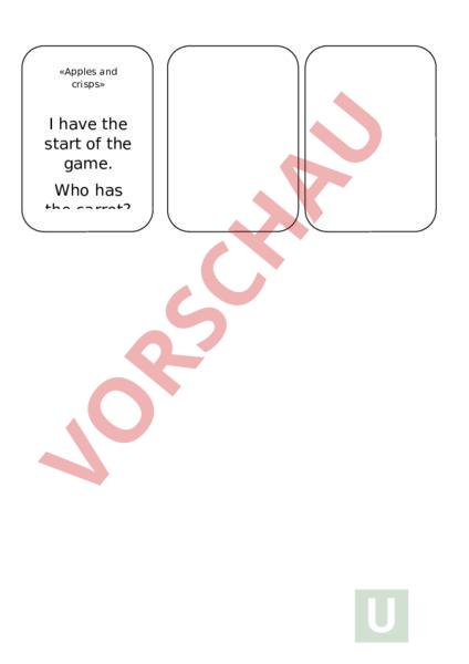 «Apples and crisps» have the start of the game. Who has the carrot? Who has the milk? Who has the bread? Who has the eggs? Who has the apple? Who has the banana? Who has the fish fingers? Who has the pear? Who has the ice cream? Who has the salad? Who has the cheese? Who has the sweets? Who has the crisps? Who has the chocolate? Who has the tomato? Who has the orange juice? Who has the sandwich? This is the end of the game.