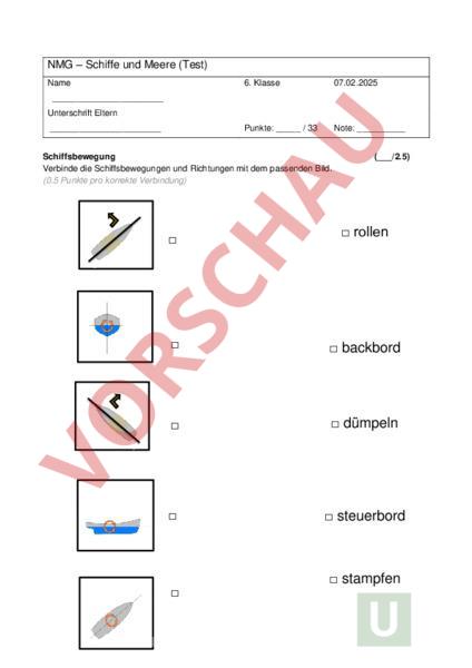NMG – Schiffe und Meere (Test) Name 6. Klasse 07.02.2025 Punkte: 33 Note: Unterschrift Eltern Schiffsbewegung Verbinde die Schiffsbewegungen und Richtungen mit dem passenden Bild. (0.5 Punkte pro korrekte Verbindung) (_/2.5) rollen backbord dümpeln steuerbord stampfen Ozeane auf der Welt (_/5.5) Beschrifte die Kontinente und die Ozeane dazwischen. (0.5 Punkte pro korrekte Beschriftung fehlerhafte Schreibweise insgesamt -0.5 Punkte) Kontinent Ozean 1: A: 2: B: 3: C: 4: D: 5: E: 6: Archimedisches Prinzip Kreuze an, ob die Aussage richtig oder falsch ist. (_/2.5) Richtig Falsch Ist die Auftriebskraft des Wassers kleiner als die Gewichtskraft des Schiffes, dann sinkt das Schiff. Der Auftrieb im Salzwasser und Süsswasser unterscheidet sich nicht. Die Gewichtskraft von 100 Knete verändert sich, wenn die gleiche Menge Knete anders geformt wird. Ein Schiff taucht so tief ein, bis es genügend Wasser für ausreichend Auftrieb verdrängt hat. Wenn ein Gegenstand durch seine Form mehr Wasser verdrängt, sinkt der Gegenstand weniger tief ins Wasser ein. Navigation (_/4.5) a) Nenne drei Hilfsmittel mit denen Schiffe auf dem Meer ihre Position, ihre Geschwindigkeit oder andere wichtige Angaben bestimmen können (oder die sie früher dafür genutzt haben). b) Schreibe, wozu die Hilfsmittel gebraucht werden und welche wichtigen Informationen die Schiffsbesatzung damit erhalten können (0.5 Punkte pro Hilfsmittel, 1 Punkt pro korrekte Beschreibung) 1. 2. 3. Nahrung aus dem Meer (_/4) a) Warum bauen die Menschen Schiffe? Nenne zwei Gründe und erläutere sie in einem Satz. (pro korrekte Antwort und Erläuterung 0.5 Punkte) Beispiel: Fischerei – um Fische zu fangen, bauten die Menschen Fischerboote. b) Nenne vier Lebensmittel, die aus dem Meer stammen. (pro korrekte Antwort und Erläuterung 0.25 Punkte) Nahrung aus Meer (Fischerei) (_ 2) a) Auf welches Problem der Fischerei macht dieses Bild aufmerksam? Lies genau und begründe. (korrekte Antwort 1 Punkt, Begründung in ganzem Satz 1 Punkt) Hinweis: selektiv bedeutet auswählend. Antrieb und Energiequelle (_ 4) a) Vervollständige die Tabelle. (korrekte Antwort 0.5 Punkt) Schiffstyp Ruderboot Antrieb Ruder Energiequelle Energieform Wind Thermische Energie Verschmutzung der Meere (_ 4) Nenne zwei Beispiele, wie Menschen die Meere belasten und nenne jeweils eine mögliche Massnahme, um die Meere besser zu schützen. (1 Punkt pro korrekte Bedrohung und 1 Punkt pro mögliche Massenahme) Beispiel: Überfischung – Grosse Fischerboote fangen viele Fische ein. Dadurch können sich die Bestände nicht mehr erholen. Massnahme – es darf nicht mehr Fisch gefangen werden. Tauchfahrt (_ 4) a) Kreuze alle richtigen Antworten an. Es können auch mehrere Antworten richtig sein. (0.5 Punkte für die korrekt angekreuzte Antwort) Was ist ein ROV? ein selbstfahrendes Segelboot. ein ferngesteuertes Tauchboot. ein motorisiertes Tretboot. Wofür wird ein ROV verwendet? Unterwasserforschung – Erforschung von Meeresböden, Wracks und Tiefseelebewesen. Inspektion und Wartung – Überprüfung und Reparatur von Unterwasserpipelines, Bohrplattformen und Kabeln. Bergungseinsätze – Suchen und Bergen von versunkenen Objekten oder Fahrzeugen. Wie heisst der tiefste Punkt im Meer Tonga-Graben Java-Graben Challenger Deep Wie wird die Fahrt eines U-Boots unter Wasser genannt? Schnorchelfahrt Tauchfahrt Walfahrt Mit welchem Ruder kann ein U-Boot unter Wasser seine Tiefe steuern? Tiefenruder Tauchruder Trimmruder Hauptteil eines U-Bootes ist der Druckraum Druckkörper Tauchzelle Zusatzaufgabe (Extrapunkte) (_ 5) Beschrifte die Abbildung und erkläre, wie das U-Boot ab- und auftaucht. Beschrifte Teile des U-Bootes die du kennst und erläutere die Funktion. (0.5 Punkte für die korrekt angekreuzte Antwort) Turm auf dem Rumpf dient als Einstieg und bei Überwasserfahrt
