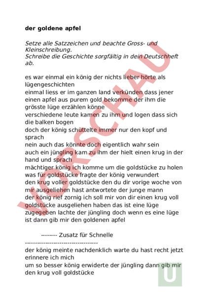 der goldene apfel Setze alle Satzzeichen und beachte Gross- und Kleinschreibung. Schreibe die Geschichte sorgfältig in dein Deutschheft ab. es war einmal ein könig der nichts lieber hörte als lügengeschichten einmal liess er im ganzen land verkünden dass jener einen apfel aus purem gold bekomme der ihm die grösste lüge erzählen könne verschiedene leute kamen zu ihm und logen dass sich die balken bogen doch der könig schüttelte immer nur den kopf und sprach nein auch das könnte doch eigentlich wahr sein auch ein jüngling kam zu ihm der hielt einen krug in der hand und sprach mächtiger könig ich komme um die goldstücke zu holen was für goldstücke fragte der könig verwundert den krug voller goldstücke den du dir vorige woche von mir ausgeliehen hast antwortete der junge mann der könig rief zornig ich soll mir von dir einen krug voll goldstücke ausgeliehen haben das ist eine lüge zugegeben lachte der jüngling doch wenn es eine lüge ist dann gib mir den goldenen apfel -------- Zusatz für Schnelle -----------------------------------der könig meinte nachdenklich warte du hast recht jetzt erinnere ich mich um so besser könig erwiderte der jüngling dann gib mir den krug voll goldstücke der könig erkannte dass ihn der junge mann überlistet hatte er lachte gab ihm den goldenen apfel und verleitete die leute nie wieder zum lügen