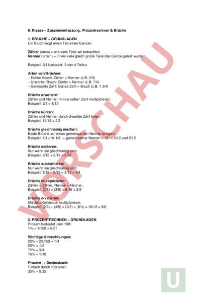 Arbeitsblatt: Zusammenfassung Brüche Prozente 6 Klasse