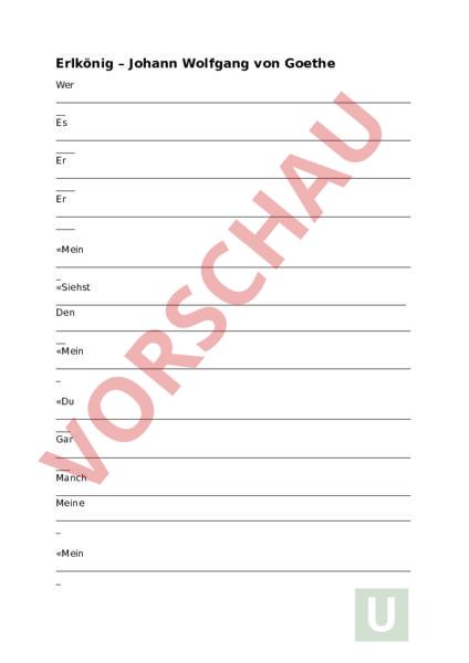 Erlkönig – Johann Wolfgang von Goethe Wer Es Er Er «Mein «Siehst Den «Mein «Du Gar Manch Meine «Mein Was «Sei In «Willst Meine Meine Und «Mein Erlkönigs «Mein Es «Ich Und «Mein Erlkönig Dem Er Erreicht In Erlkönig – Johann Wolfgang von Goethe Wer reitet so spät durch Nacht und Wind? Es ist der Vater mit seinem Kind; Er hat den Knaben wohl in dem Arm, Er fasst ihn sicher, er hält ihn warm. «Mein Sohn, was birgst du so bang dein Gesicht? «Siehst Vater, du den Erlkönig nicht? Den Erlenkönig mit Kron und Schweif?» «Mein Sohn, es ist ein Nebelstreif.» «Du liebes Kind, komm, geh mit mir! Gar schöne Spiele spiel ich mit dir Manch bunte Blumen sind an dem Strand. Meine Mutter hat manch gülden Gewand.» «Mein Vater, mein Vater, und hörest du nicht, Was Erlenkönig mir leise verspricht?» «Sei ruhig, bleibe ruhig, mein Kind; In dürren Blättern säuselt der Wind.» «Willst, feiner Knabe, du mit mir gehen? Meine Töchter solln dich warten schön; Meine Töchter führen den nächtlichen Rhein, Und wiegen und tanzen und singen dich ein.» «Mein Vater, mein Vater, und siehst du nicht dort Erlkönigs Töchter am düsteren Ort?» «Mein Sohn, mein Sohn, ich seh es genau; Es scheinen die alten Weiden so grau.» «Ich liebe dich, mich reizt deine schöne Gestalt; Und bist du nicht willig, so brauch ich Gewalt.» «Mein Vater, mein Vater, jetzt fasst er mich an! Erlkönig hat mir ein Leids getan!» Dem Vater grausets, er reitet geschwind, Er hält in den Armen das ächzende Kind, Erreicht den Hof mit Müh und Not; In seinen Armen das Kind war tot.