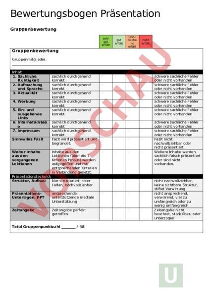 Bewertungsbogen Präsentation Gruppenbewertung sehr gut erfüllt gut erfüllt unzureiche nd erfüllt nicht erfüllt Gruppenbewertung Gruppenmitglieder: Inhalt 1. Sachliche Richtigkeit 2. Aufmachung und Sprache 3. Aktualität 4. Werbung 5. Ein- und ausgehende Links 6. Internetadress 7. Impressum Sinnvolles Fazit Weiter Inhalte aus den vergangenen Lektionen sachlich korrekt sachlich korrekt sachlich korrekt sachlich korrekt sachlich korrekt durchgehend 4 3 2 1 durchgehend 4 3 2 1 durchgehend 4 3 2 1 durchgehend 4 3 2 1 durchgehend 4 3 2 1 sachlich durchgehend korrekt sachlich durchgehend korrekt Fazit wird präsentiert und begründet. 4 3 2 1 4 3 2 1 4 3 2 1 Inhalte aus den Lektionen (über die 7 Kriterien hinaus) werden aufgegriffen und mit entsprechenden Kriterien in Verbindung gesetzt. 4 3 2 1 4 3 2 1 Präsentationstechnick Struktur, Aufbau klar strukturiert, roter Faden, nachvollziehbar PräsentationsUnterlagen, PPT ansprechende, unterstützende mediale Unterstützung 4 3 2 1 Zeitangabe Zeitangabe perfekt getroffen 4 3 2 1 Total Gruppenpunktzahl 48 schwere sachliche Fehler oder nicht vorhanden schwere sachliche Fehler oder nicht vorhanden schwere sachliche Fehler oder nicht vorhanden schwere sachliche Fehler oder nicht vorhanden schwere sachliche Fehler oder nicht vorhanden schwere sachliche Fehler oder nicht vorhanden schwere sachliche Fehler oder nicht vorhanden Fazit nicht nachvollziehbar oder nicht präsentiert. Weitere Inhalte werden sachlich falsch präsentiert oder sind nicht vorhanden. nicht nachvollziehbar, keine sichtbare Struktur, stiftet Verwirrung nicht ansprechend, verwirrend, viel zu umfangreich oder zu wenig umfangreich Zeitangabe nicht beachtet, stark über- oder unterzogen Gruppenbewertung Person 1 sehr gut erfüllt gut erfüllt unzureiche nd erfüllt nicht erfüllt Einzelbewertung Gruppenmitglied: Sprache Sprache, Ausdruck, Sprechtempo, Stimme Auftreten Blickkontakt, Gestik Mimik, verständlich und nachvollziehbar, angemessenes Vokabular, rhetorische Sicherheit, angemessenes Tempo, gute Intonation, man hört gerne zu, angemessene Lautstärke 4 3 2 1 nicht verständlich, wenig Vokabular oder zu komplizierter Ausdruck, zu langsam oder zu schnell, stockend, monoton, einschläfernd, zu leise oder zu laut, schwer verständlich, zuhören strengt an freier Vortrag, Blickkontakt zum gesamten Publikum, offene und einladende Haltung, dem Publikum zugewandt, Mimik ist entspannt und der Thematik angemessen 4 3 2 1 kein Blickkontakt vorhanden, Fixieren oder Ablesen von Folien oder Kärtchen, dem Publikum abgewandt, über- oder untertriebene Mimik, irritierendes Gestikulieren, Total Einzelpunktzahl 8 Anmerkungen: Gesamtpunktzahl: 56 Gesamtnote: Gruppenbewertung Person 2 sehr gut erfüllt gut erfüllt unzureiche nd erfüllt nicht erfüllt Einzelbewertung Gruppenmitglied: Sprache Sprache, Ausdruck, Sprechtempo, Stimme Auftreten Blickkontakt, Gestik Mimik, verständlich und nachvollziehbar, angemessenes Vokabular, rhetorische Sicherheit, angemessenes Tempo, gute Intonation, man hört gerne zu, angemessene Lautstärke 4 3 2 1 nicht verständlich, wenig Vokabular oder zu komplizierter Ausdruck, zu langsam oder zu schnell, stockend, monoton, einschläfernd, zu leise oder zu laut, schwer verständlich, zuhören strengt an freier Vortrag, Blickkontakt zum gesamten Publikum, offene und einladende Haltung, dem Publikum zugewandt, Mimik ist entspannt und der Thematik angemessen 4 3 2 1 kein Blickkontakt vorhanden, Fixieren oder Ablesen von Folien oder Kärtchen, dem Publikum abgewandt, über- oder untertriebene Mimik, irritierendes Gestikulieren, Total Einzelpunktzahl 8 Anmerkungen: Gesamtpunktzahl: 56 Gesamtnote: Gruppenbewertung Person 3 sehr gut erfüllt gut erfüllt unzureiche nd erfüllt nicht erfüllt Einzelbewertung Gruppenmitglied: Sprache Sprache, Ausdruck, Sprechtempo, Stimme Auftreten Blickkontakt, Gestik Mimik, verständlich und nachvollziehbar, angemessenes Vokabular, rhetorische Sicherheit, angemessenes Tempo, gute Intonation, man hört gerne zu, angemessene Lautstärke 4 3 2 1 nicht verständlich, wenig Vokabular oder zu komplizierter Ausdruck, zu langsam oder zu schnell, stockend, monoton, einschläfernd, zu leise oder zu laut, schwer verständlich, zuhören strengt an freier Vortrag, Blickkontakt zum gesamten Publikum, offene und einladende Haltung, dem Publikum zugewandt, Mimik ist entspannt und der Thematik angemessen 4 3 2 1 kein Blickkontakt vorhanden, Fixieren oder Ablesen von Folien oder Kärtchen, dem Publikum abgewandt, über- oder untertriebene Mimik, irritierendes Gestikulieren, Total Einzelpunktzahl 8 Anmerkungen: Gesamtpunktzahl: 56 Gesamtnote: Gruppenbewertung Person 4 sehr gut erfüllt gut erfüllt unzureiche nd erfüllt nicht erfüllt Einzelbewertung Gruppenmitglied: Sprache Sprache, Ausdruck, Sprechtempo, Stimme Auftreten Blickkontakt, Gestik Mimik, verständlich und nachvollziehbar, angemessenes Vokabular, rhetorische Sicherheit, angemessenes Tempo, gute Intonation, man hört gerne zu, angemessene Lautstärke 4 3 2 1 nicht verständlich, wenig Vokabular oder zu komplizierter Ausdruck, zu langsam oder zu schnell, stockend, monoton, einschläfernd, zu leise oder zu laut, schwer verständlich, zuhören strengt an freier Vortrag, Blickkontakt zum gesamten Publikum, offene und einladende Haltung, dem Publikum zugewandt, Mimik ist entspannt und der Thematik angemessen 4 3 2 1 kein Blickkontakt vorhanden, Fixieren oder Ablesen von Folien oder Kärtchen, dem Publikum abgewandt, über- oder untertriebene Mimik, irritierendes Gestikulieren, Total Einzelpunktzahl 8 Anmerkungen: Gesamtpunktzahl: 56 Gesamtnote: