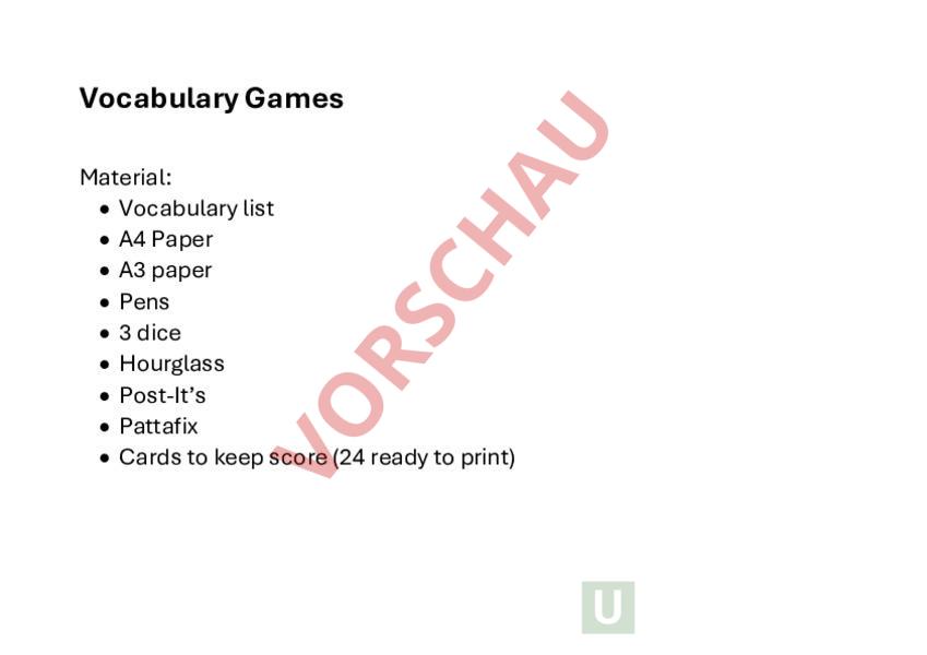 Inklusive druckfertiger Anleitung zum aufhängen, Score Cards und Materialliste. 10min alleine Voca üben, dann jeweils 5min in Vierergruppen spielen, wechseln, vier Runden möglich.