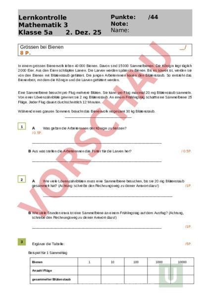 Lernkontrolle Mathematik 3 Klasse 5a 2. Dez. 25 Punkte: Note: Name: /44 / Grössen bei Bienen 8 P. In einem grossen Bienenvolk leben 40 000 Bienen. Davon sind 15 000 Sammelbienen. Die Königin legt täglich 2 000 Eier. Aus den Eiern schlüpfen Larven. Die Larven werden später zu Bienen. Bis es soweit ist, werden sie von den Bienen mit Blütenstaub gefüttert. Die jungen Arbeiterinnen kauen den Blütenstaub. So entsteht das Bienenbrot, mit dem die Königin und die Larven gefüttert werden. Eine Sammelbiene besucht pro Flug mehrere Blüten. Sie kann pro Flug maximal 20 mg Blütenstaub sammeln. Von einer Löwenzahnblüte gewinnt sie 2 mg Blütenstaub. An einem Frühlingstag schafft eine Sammelbiene 25 Flüge. Jeder Flug dauert durchschnittlich 12 Minuten. Während eines ganzen Sommers braucht das Bienenvolk insgesamt 30 kg Blütenstaub. 1 Was geben die Arbeiterinnen der Königin zu fressen? 0.5P. Aus was stellen die Arbeiterinnen das Futter für die Larven her? 0.5P. 2 Wie viele Löwenzahnblüten muss eine Sammelbiene besuchen, bis sie 20 mg Blütenstaub gesammelt hat? (Achtung: schreibe den Rechnungsweg zu deiner Antwort dazu!) /1P. Wie viele Stunden etwa ist eine Sammelbiene an einem Frühlingstag auf dem Ausflug? (Achtung, schreibe den Rechnungsweg zu deiner Antwort dazu!) 3 /1P. Ergänze die Tabelle: /5P. Beispiel für 1 Sammeltag Bienen Anzahl Flüge gesammelter Blütenstaub 1 10 100 1000 10000 Grössen mit und ohne Komma /16 P. 2 3 Schreibe in Fr. und Rp. 5.50 Fr. Fr. Rp. 1.05 Fr. Fr. Rp. 280 Rp. Fr. Rp. 305 Rp. Fr. Rp. (pro Umrechnung 0.5P.) Schreibe in und dm. 3,4 dm 230 cm dm 12 dm dm 302 dm dm Schreibe in und kg. 2,5 kg 1,01 kg 2 003 kg kg 10 010 kg kg Schreibe in und cm 5,31 cm 9,05 cm 208 cm cm 1 001 cm cm Schreibe in und mm 4 1,010 mm 1,5 mm 2 050 mm mm 5 600 mm mm Schreibe mit Komma oder Punkt. 8 Fr. 70 Rp. Schreibe in mit Komma. Fr. 1 Fr. 20 Rp. Fr. 20 Fr. 5 Rp. Fr. 10 Fr. 1 Rp. Fr. Schreibe in mit Komma. 6 3 dl 5 2 cl 2 65 ml 4 3 dm 2 15 cm 5 3 cm 1m 1mm 3 502 ml Versteckte Zahlen /8 P. 1 Finde x. /2P. :5 –8 •7 28 x 2 5 Bestimme die unbekannte Zahl. Zeichne passende Pfeildiagramme, so wie bei Aufgabe 1: Ich denke mir eine Zahl, multipliziere sie mit 9, subtrahiere 30, dividiere durch 50 und erhalte 3. /2P. Welche Zahl kann sein? /4P. z 11 20 7 • 21 21 – 3 Dz:84 Aufrunden Abrunden /12 P. /6P. 3 4 Runde auf ganze Zehner Runde auf ganze Hunderter Runde auf ganze Tausender 67 728 5 492 84 249 4 307 13 351 2 501 95 961 9 880 Runde. /6P. Länge in GotthardBasistunnel 57104 FurkaBasistunnel 15381 HauensteinBasistunnel 8051 Gletsch-Tunnel 548 Gerundet auf 10 Gerundet auf 100 Gerundet auf 1000