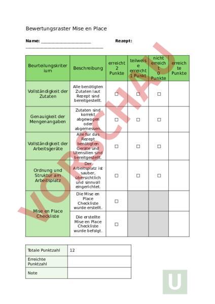 Bewertungsraster Mise en Place Name: Rezept: teilweis erreicht 1 Punkt nicht erreich 0 Punkte Beurteilungskriter ium Beschreibung erreicht 2 Punkte Vollständigkeit der Zutaten Alle benötigten Zutaten laut Rezept sind bereitgestellt. Der Arbeitsplatz ist sauber, übersichtlich und sinnvoll eingerichtet. Die Mise en Place Checkliste wurde erstellt. Die erstellte Mise en Place Checkliste wurde befolgt. Genauigkeit der Mengenangaben Vollständigkeit der Arbeitsgeräte Ordnung und Struktur am Arbeitsplatz Mise en Place Checkliste Totale Punktzahl Erreichte Punktzahl Note Zutaten sind korrekt abgewogen oder abgemessen. Alle für das Rezept benötigten Geräte und Utensilien sind bereitgestellt. 12 erreich te Punkte Unterschrift