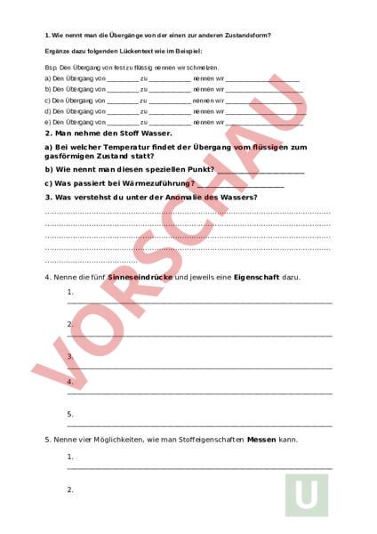1. Wie nennt man die Übergänge von der einen zur anderen Zustandsform? Ergänze dazu folgenden Lückentext wie im Beispiel: Bsp. Den Übergang von fest zu flüssig nennen wir schmelzen. a) Den Übergang von zu nennen wir b) Den Übergang von zu nennen wir c) Den Übergang von zu nennen wir d) Den Übergang von zu nennen wir e) Den Übergang von zu nennen wir 2. Man nehme den Stoff Wasser. a) Bei welcher Temperatur findet der Übergang vom flüssigen zum gasförmigen Zustand statt? b) Wie nennt man diesen speziellen Punkt? c) Was passiert bei Wärmezuführung? 3. Was verstehst du unter der Anomalie des Wassers? . 4. Nenne die fünf Sinneseindrücke und jeweils eine Eigenschaft dazu. 1. 2. 3. 4. 5. 5. Nenne vier Möglichkeiten, wie man Stoffeigenschaften Messen kann. 1. 2. 3. 4. 6. Schreibe die Formel auf, mit welcher man die Dichte berechnen kann. 7. Nenne je zwei Stoffe, welche bei Raumtemperatur (20ºC) 1.fest, 2.flüssig und 3.gasförmig vorkommen. 1. 2. 3. 8. Benenne direkt in die Grafik was du kennst und zeichne jeweils das Kugelmodell in den Kreis. 9. Stoffeigenschaften: Stoffe erkennt man an ihren Eigenschaften. Einige kann man mit den Sinnesorganen ermitteln, für andere benötigt man Hilfsmittel. Nenne je 3 Eigenschaften: Ermitteln mit den Sinnen: Ermitteln mit Hilfsmitteln: 10. Trage je zwei Stoffeigenschaften zu den folgenden Stoffen in die Tabelle ein. Du darfst nicht zweimal die gleiche Eigenschaft verwänden. Stoff Stoffeigenschaft 1 Stoffeigenschaft 2 Granit hart wasserunlöslich Salz Eisen Magnesium 11. Zucker wurde mit Wasser beziehungsweise Benzin vermischt, Pflanzenöl ebenso. Ordne die Mischungen den Reagenzgläsern 1-4 zu. (1) Reagenzglas 1: Reagenzglas 2: Reagenzglas 3: Reagenzglas 4: 12. Vor dir liegen drei Stoffproben. Eine davon ist Kochsalz, eine Puderzucker und eine Gips. Wie kannst du die drei Stoffe eindeutig voneinander unterscheiden? Denke daran, dass du keine Geschmacksprobe durchführen darfst. 13. Definitionen: a) Was verstehst du unter Dichte? b) Was verstehst du unter Löslichkeit?