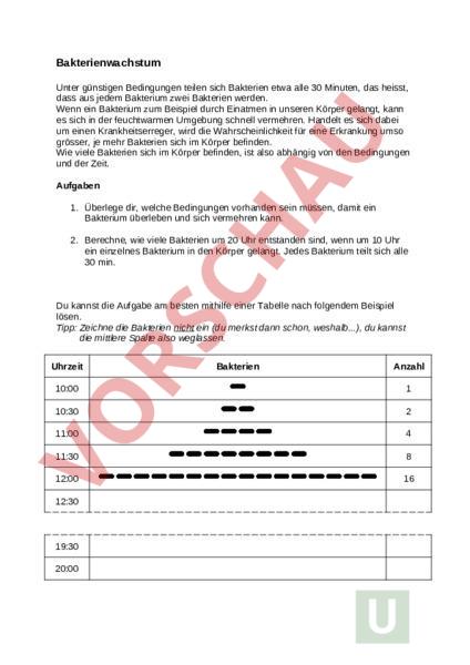 Bakterienwachstum Unter günstigen Bedingungen teilen sich Bakterien etwa alle 30 Minuten, das heisst, dass aus jedem Bakterium zwei Bakterien werden. Wenn ein Bakterium zum Beispiel durch Einatmen in unseren Körper gelangt, kann es sich in der feuchtwarmen Umgebung schnell vermehren. Handelt es sich dabei um einen Krankheitserreger, wird die Wahrscheinlichkeit für eine Erkrankung umso grösser, je mehr Bakterien sich im Körper befinden. Wie viele Bakterien sich im Körper befinden, ist also abhängig von den Bedingungen und der Zeit. Aufgaben 1. Überlege dir, welche Bedingungen vorhanden sein müssen, damit ein Bakterium überleben und sich vermehren kann. 2. Berechne, wie viele Bakterien um 20 Uhr entstanden sind, wenn um 10 Uhr ein einzelnes Bakterium in den Körper gelangt. Jedes Bakterium teilt sich alle 30 min. Du kannst die Aufgabe am besten mithilfe einer Tabelle nach folgendem Beispiel lösen. Tipp: Zeichne die Bakterien nicht ein (du merkst dann schon, weshalb.), du kannst die mittlere Spalte also weglassen. Uhrzeit Bakterien Anzahl 10:00 1 10:30 2 11:00 4 11:30 8 12:00 16 12:30 19:30 20:00 Weiterführende Aufgaben 3. Stelle das Bakterienwachstum für die ersten sechs Stunden (10:00 16:00) in Excel als Liniendiagramm dar. Auf der x-Achse (waagrecht) soll die Zeit eingetragen werden und auf der y-Achse (senkrecht) die Anzahl der Bakterien. 4. Wie kannst du die Kurve beschreiben? 5. Die tatsächliche Anzahl Bakterien liegt in Wirklichkeit etwas unter den berechneten Werten. Woran könnte das liegen? 6. Was kann man tun, um die Vermehrung der Bakterien zu bremsen? 7. Kannst du in Excel eine Formel erstellen, welche als Resultat die vorherige Zahl immer verdoppelt? So kannst du leicht die Anzahl Bakterien für einen Tag oder länger berechnen und als Diagramm darstellen und auch die Anzahl der Startbakterien ändern.