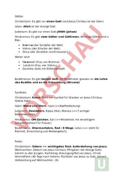 Götter: Christentum: Es gibt nur einen Gott (und Jesus Christus ist der Sohn) Islam: Allah ist der einzige Gott Judentum: Es gibt nur einen Gott JHWH (Jahwe) Hinduismus: Es gibt viele Götter und Göttinnen, Wichtige Götter sind z. Bsp.: Brahma (der Schöpfer der Welt) Vishnu (der Erhalter der Welt) Shiva (der Zerstörer und Erneuerer) Weiter sind: Saraswati (Frau von Brahma) Lakshmi (Frau von Vishnu) Ganesha (Gott mit Elefantenkopf) Buddhismus: Es gibt keinen Gott, die Buddhisten glauben an die Lehre des Buddha und an die Erleuchtung (Nirvana) Symbole: Christentum: Kreuz, Fisch (Symbol für Glauben an Jesus Christus, Gottes Sohn Islam: Mond und Stern, hijab (Kopfbedeckung) Judentum: Davidstern, Kippa (Hut), Menora (7-armiger Kerzenleuchter) Hinduismus: OM-Zeichen, Sari (Wickelrock mit einseitigem Schulterüberwurf für Frauen) Buddhismus: Dharmachakra, Rad 8 Wege, Lotus ( steht für Reinheit, Erleuchtung und Wiedergeburt) Feste: Christentum: Ostern wichtigstes Fest: Auferstehung von Jesus, Weihnachten: Geburt von Jesus Christus, Pfingsten: der Heilige Geist kommt zu den Jüngern, Karfreitag: Kreuzigung/Tod von Jesus, Christi Himmelfahrt (40 Tage nach Ostern): Rückkehr von Jesus zu Gott, Advent: Vorbereitung auf Weihnachten (6) Islam: Ramadan: Fastenmonat (tagsüber nichts essen und trinken, von Sonnenaufgang – Sonnenuntergang), Zuckerfest: Fest am Ende des Ramadans, Opferfest (wichtigste): Erinnerung an Abrahams Breitschaft, seinen Sohn zu opfern, Mawlid an-Nabi: Geburtstag des Propheten Mohammed (4) Judentum: Pessach: Erinnerung an die Befreiung der Juden aus der Sklaverei in Ägypten, Jom Kippur wichtigstes Fest: Versöhnungstag zwischen Menschen und Gott, sie bitten Gott um Vergebung für ihre Sünden ( 25 Stunden kein Essen, kein Trinken, kein Arbeiten), Chanukka: Lichterfest (erinnert daran, dass das Öl im Tempel von Jerusalem wie durch ein Wunder 8 Tage lang brannte), Sukkot: Laubhüttenfest ( Erinnerung an die 40-järhige Wüstenwanderung), es ist ein Freudenfest. (4) Hinduismus: Diwali (wichtigste): Lichterfest, Sieg des Guten über das Böse und Sieg des Lichts über die Dunkelheit ( Häuser werden geschmückt mit Lichtern und Öllampen), Holi: Farbenfest/Frühlingsfest mit Feuerwerk und Farbschlacht), Raksha Bandhan: Fest der Geschwisterliebe ( Schwester bindet dem Bruder ein Armband um das Handgelenk, symbolisiert Verbundenheit), Navaratri: Fest zu Ehren der Göttin Durga ( dauert 9 Nächte und 10 Tage). (4) Buddhismus: Vesak (wichtigste): Geburtstag, Erleuchtung und Tod Buddhas (sie gehen in Tempel, meditieren und tun gute Taten), Ullambana: Ahnenfest, um verstorbenen Seelen Frieden zu bringen ( Menschen bringen Opfergaben wie z. Bsp. Essen, Kerzen), Losar: Tibetisches Neujahrsfest ( Familien besuchen sich, festliche Kleidung, Räucherwerk). (3) Essensvorschriften: Christentum: keine strenge Essensvorschriften, manche Christen verzichten in der Fastenzeit ( Aschermittwoch bis Ostern) auf Fleisch, Süsses oder Alkohol. Am Karfreitag essen viel Christen kein Fleisch, sondern z, Bsp. Fisch Islam: Halal erlaubt, Haram verboten, Schweinefleisch und Alkohol ist verboten. Tiere müssen via „Halal-Schlachtung geschlachtet werden. Während des Ramadan darf nichts gegessen oder getrunken werden tagsüber (zwischen Sonnenaufgang und Sonnenuntergang) Judentum: Koschere Gesetze/Kaschrut. Schweinefleisch und Schalentiere sind verboten. Nur Fleisch von Tieren mit gespaltenen Hufen Wiederkäuer ist erlaubt (Schafe, Kühe). Tiere müssen durchSchächtengeschlachtet werden. Fleisch und Milchprodukte dürfen nichtzusammen gegessen werden. Es gibt besondere Speisen zu Festen, z. Bsp. ungesäuerte Brot (Matzen) an Pessach. Hinduismus: Viele Hindus sind Vegetarier, Kühe gelten als heilig Rindfleisch ist streng verboten! Auch Alkohol wird von gläubigen Hindus meist gemieden. Buddhismus: Viele Buddhisten sind Vegetarier oder Veganer, weil sie kein Lebewesen töten wollen. Auch Alkohol wird gemieden, weil er den Geist trübt. Regeln im Alltag/Rituale: Christentum: Christen beten zu Gott – dies kann von zu Hause oder in der Kirche geschehen; es gibt keine strikte Regeln, wann, wo und wie oft man beten soll. Es gibt die 10 Gebote (z. Bsp. nicht stehlen, töten oder lügen). Am Sonntag findet ein Gottesdienst in der Kirche statt. Christen kommen zusammen um zu beten, zu singen, die Predigt anzuhören. Weiter Rituale sind: Taufe, Erstkommunion, Firmung (kath.) oder Konfirmation (ref.) Islam: Muslime beten 5 mal täglich auf einem Gebetsteppich Richtung Mekka zu Allah. Tägl. Gebet „Salat. Sie nehmen eine rituelle Waschung vor dem Gebet vor. Reinheit ist im Islam ein Ausdruck von Respekt gegenüber Allah, dem Gott. Es gibt de 5 Säulen im Islam: 1. Glaubensbekenntnis (Schahada), 2. 5x beten tägli., 3. Almosensteuer, 4. Fasten im Monat Ramadan, 5. Pilgerfaht nach Mekka Judentum: Der Sabbat (Samstag) ist der Ruhetag (es darf nicht gearbeitet werden) an dem Glaube und Familie im Mittelpunkt stehen. Es werden besondere Speisen vorbereitet und aus der Tora gelesen. Die Mizwot enthalten 613 Gebote und Verbote in der Tora. Hinduismus: Rituale mit Licht, Duft und Opfergaben spielen eine wichtige Rolle. Gläubige zünden Kerzen (oder Lampen) an, bringen Blumen, Früchte oder Reis und verehren damit ihre Gottheiten. Sie beten dazu. Diese Rituale sollen Dankbarkeit ausdrücken. Sie leben nach Ahimsa Gewaltlosigkeit. Die Kuh ist heilig ( Symbol des Lebens und der Nahrung). Buddhismus: Es ist üblich, dass Mönche Gaben empfangen – z. Bsp. Reis oder andere Nahrungsmittel. Die Gläubigen spenden, um Dankbarkeit zu zeigen. Die Mönche leben sehr bescheiden und konzentrieren sich auf Lehre und Meditation. Viele Gläubiger meditieren täglich. Es gibt die 5 Grundregeln (Silas) der Buddhisten: 1. Nicht töten, 2. nicht stehlen, 3. nicht lügen, 4. Kein sexueller Missbrauch, 5. Keine Drogen oder Alkohol