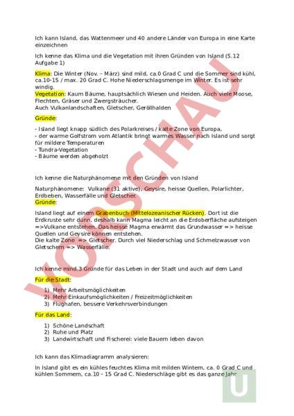Ich kann Island, das Wattenmeer und 40 andere Länder von Europa in eine Karte einzeichnen Ich kenne das Klima und die Vegetation mit ihren Gründen von Island (S.12 Aufgabe 1) Klima: Die Winter (Nov. – März) sind mild, ca.0 Grad und die Sommer sind kühl, ca.10-15 max. 20 Grad C. Hohe Niederschlagsmenge im Winter. Es ist sehr windig. Vegetation: Kaum Bäume, hauptsächlich Wiesen und Heiden. Auch viele Moose, Flechten, Gräser und Zwergsträucher. Auch Vulkanlandschaften, Gletscher, Geröllhalden Gründe: Island liegt knapp südlich des Polarkreises kalte Zone von Europa, der warme Golfstrom vom Atlantik bringt warmes Wasser nach Island und sorgt für mildere Temperaturen Tundra-Vegetation Bäume werden abgeholzt Ich kenne die Naturphänomene mit den Gründen von Island Naturphänomene: Vulkane (31 aktive), Geysire, heisse Quellen, Polarlichter, Erdbeben, Wasserfälle und Gletscher. Gründe: Island liegt auf einem Grabenbuch (Mittelozeanischer Rücken). Dort ist die Erdkruste sehr dünn, deshalb kann Magma leicht an die Erdoberfläche aufsteigen Vulkane entstehen. Das heisse Magma erwärmt das Grundwasser heisse Quellen und Geysire können entstehen. Die kalte Zone Gletscher. Durch viel Niederschlag und Schmelzwasser von Gletschern Wasserfälle. Ich kenne mind.3 Gründe für das Leben in der Stadt und auch auf dem Land Für die Stadt: 1) Mehr Arbeitsmöglichkeiten 2) Mehr Einkaufsmöglichkeiten Freizeitmöglichkeiten 3) Flughafen, bessere Verkehrsverbindungen Für das Land: 1) Schöne Landschaft 2) Ruhe und Platz 3) Landwirtschaft und Fischerei: viele Bauern leben davon Ich kann das Klimadiagramm analysieren: In Island gibt es ein kühles feuchtes Klima mit milden Wintern, ca. 0 Grad und kühlen Sommern, ca.10 15 Grad C. Niederschläge gibt es das ganze Jahr hindurch, besonders viel in den Wintermonaten. Am wenigsten regnet es von ca, Mai – August. Ich weiss wie Geysire funktionieren Geysire sind heisse Springquellen, die in zeitlichen Intervallen Wasser mit grosser Kraft ausstossen. Sie besitzen einen Kanal (wie eine Wassersäule), der in einen unterirdischen Schacht (Geysirbecken) führt. Das Grundwasser wird durch das Magma erhitzt. Das Wasser kann auch bei über 100 Grad nicht kochen durch den hohen Druck der Wassersäule. Wenn es dann endlich kocht, entstehen Dampfblasen und Wasser fliesst aus dem Kanal. Immer mehr Wasser verdampft und der Dampf dehnt sich aus bis der Druck zu gross wird und das heisse Wasser (und Dampf) als Fontäne aus dem Boden geschleudert wird. (bis zu 100m). Ich weiss, warum der Energieverbrauch von Island kein Problem ist Weil fast die gesamte Energie aus Erdwärme (Geothermie) gewonnen wird erneuerbare Energie. (Erdwärme wir gewonnen aus heissen Quellen tief im Boden). Deshalb ist hohe Energieverbauch vertretbar Ich kann etwas über den Tourismus, Ebbe und Flut, Schutzdamm, Wattenmeer, Friesland, Landgewinnung, Windenergie und Tiere und Pflanzen zu Friesland sagen Tourismus (in Friesland): Gegend ist beliebt für Wanderungen (Wattwanderungen), Vogelbeobachtungen, Radfahren, und Kurbäder. Ebbe und Flut (in Friesland): die Bewegung des Wassers wird durch die Anziehungskraft des Mondes und der Sonne sowie der Fliehkraft der Erdrotation ausgelöst. Abstand zwischen Ebbe und Flut beträgt 6h 12 Min. In 25 Std. gibt es 2 Ebbe und 2x Flut. Schutzdamm: Deiche Dämme werden gebaut, um die Küsten vor Sturmfluten und Hochwasser zu schützen. Wattenmeer: Es befindet sich an der Nordseeküste und erstreckt sich von Niederlanden über Deutschland bis nach Dänemark und hat eine Fläche von 9‘000 km2 (5x Kanton ZH)! Es ist geprägt von Ebbe und Flut. Das Gebiet, das man bei Ebbe sieht, nennt man Watt. Es ist ein wichtiger Lebensraum für Tiere und Pflanzen. Seit 2009 gehört es zum UNESCO- Weltnaturerbe. Friesland: Region in den Niederlanden und ist stark vom Wattenmeer geprägt. Landgewinnung: Dien Küsten werden aufgeschüttet, dazu nutzt man die Schlammablagerungen vom Meer. Ein System aus Pfählen vom Ufer bis ins Meer beruhigt das Meer und verlangsamt das Abfliessen bei Ebbe. Dadurch lagert sich Sand ab. Wenn das Land hoch genug ist, wird ein Deich gebaut. Vorteil: neues Land für Landwirtschaft Schutz vor Überschwemmungen Nachteil: das Wattenmeer wird zerstört. Windenergie: Es gibt oft starke Winde an der Nordsee, deshalb hat es viele Windkraftanlangen an Land sowie im Meer, sog. Windparks. Die Windkraft gehört zu der erneuerbaren Energie. Nachteile sind: Unregelmässige Produktion von Strom (je nach Windstärke verschieden), Flugbahnen der Vögel werden eingeschränkt. Tiere und Pflanzen: Möwen, 2 Mio. Zugvögel, im Wattenmeer gibts Wattwürmer, Krebse, Schnecken, Muscheln (z. Bsp. Herzmuschel, Scheidenmuschel) Seehunde, Kegelrobben, Schweinswale. (9) Es gibt viele Pflanzen, die speziell angepasst sind an die Watt und Salzwasser benötigen: z, Bsp. Queller, Andelgras, Strandaster (3) Ich kann Ebbe und Flut erklären Die Bewegung des Wassers wird durch die Anziehungskraft des Mondes, der Sonne und der Fliehkraft der Erdrotation ausgelöst. Der Mond zieht das Wasser der Erde auf der mondzugewandten Seite an und ein Wasserberg entsteht ( Flut). Auf der mondabgewandten Seite entsteht ein zweiter Wasserberg, der durch die Fliehkraft (Zentrifugalkraft) der Erde entsteht. Die Ebbe liegt zwischen den beiden Flutbergen. Da sich die Erde um sich selbst dreht, verschieben sich auch die Wasserberge (2x Flut und 2x Ebbe pro Tag). Bei Vollmond und Neumond ist die Flut besonders stark, weil Mond, Sonne und Erde au eine Geraden stehen Springflut. Bei Halbmond ist die Flut am geringsten, da die Sonne im rechten Winkel zur Erd-Mond-Achse steht (Sonne und Mond gleichen sich gegenseitig aus) Nippflut.