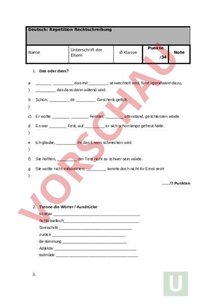 Deutsch: Repetition Rechtschreibung Name Unterschrift der Eltern Ø Klasse Punkte /34 Note 1. Das oder dass? das mit verwechselt wird, führt irgendwann dazu, das dass dann wütend wird. Schön, dir Geschenk gefällt. c) Er wollte Fenster, offenstand, geschlossen würde. Es war Fest, auf er sich schon lange gefreut hatte. e Ich glaube, ihr das Essen schmecken wird. f) Sie hofften, der Test nicht so schwer sein würde. Sie wollte nicht mitkommen; konnte doch nicht ihr Ernst sein! /7 Punkten 2. Trenne die Wörter Ausdrücke kostbar Schlüsselloch Sinnschritt zurück Bestimmung Adjektiv todmüde 3. 4. WIDER oder WIEDER? derhaken derkäuer W_dergabe ein w_derlicher Geruch ein Geschäft w_der eröffnen mir ist ein grosses Unglück w_derfahren die Schritte hallten auf dem Pflaster w_der Seine Fähigkeit w_der entdecken 5. Setze die richtige Endung ein und bestimme die Fälle (Nom, Akk, Dat, Gen) der unterstrichenen Wörter. Der Abteilungsleiter diktiert sein_ Sekretärin ein Brief. Sein_ Freundin schenkt Max jed_ Tag ein schön_ Blumenstrauss. Der Kellner bringt d Gästen d_ Suppe. Der Rauchfang d_ Haus_ war eingestürzt. Begegnest du sehr oft (der Chef) (das Kleid) gefällt (meine Schwester) nicht. Giftstoffe schaden (die Menschheit). Wohin (der Weg)? 6. Gross- und Kleinschreibung der himmel war grau und violett, als wir starteten. Ich spürte özal in meinem rücken. Die strassen waren leer, und ich drehte voll auf. Dabei entsteht ein gefühl, wie es die alten nie haben werden. Ich will auch gar nicht versuchen, es zu beschreiben, denn dieses feeling hast du, oder du hast es nicht. Die strassen wurden kurviger, je näher wir den bergen kamen. Pässe zu fahren ist einfach das höchste. Du legst dich in die kurve, schneidest sie an, pendelst sie aus, ziehst die maschine kurz wieder hoch und bereitest die nächste wiege vor. Im helm rauscht es, de bäume flitzen an dir vorbei, pfeiler der leitplanken, der weisse mittelstreifen bleibt hinter dir liegen und du hörst musik. 7. Schreibe die folgenden Wörter richtig. Vol Kan , Susa_e. Der di Zuerbä_ Die Stim kan kip. Durch die Lu sah sie den hote glü_lich in der e_elhaften Spu . E_der Ba_stube. Moni_a ist die Diretorin Mit Her und Schmer_ macht der Kaaofabri_. Sie liebt man keine Scher_e. Scho_olade un Set. Walter hat e ales Beim Bäcker kaufte ich einen L alte Holz von Hand Brot. gespal_ten. Durch den weissen H war ich an Eine Gitar_e hat sechs S_ten. L_ und Leben gefährdet. Napoleon krönte sich zum K_iser Im T findet man oft Lch. der Franzosen. 8. Wie wirds geschrieben? Plural von Geständnis Getrennt lebend oder getrenntlebend Gestern nacht oder gestern Nacht Plural von Gewebe Infinitiv des Verbs: hat gesundgeschrieben Artikel zu Scherz 2. Person Singular von scherzen 2. Person Singular von schneiden 2. Person Singular von spinnen 2. Person Singular von schmelzen Le er Lo erie Der Eeu Derorteil Die Ko_ision Das Schleermaul Lösungen 1. Das oder dass? Ein Geizhals zu Kufa hatte gehört, dass es in Bassora einen gebe, der noch geiziger sei als er. Willkommen sprach der Geizhals von Bassora, Das trifft sich gut. Ich will das Beste vorsetzen. Gehen wir zum Markt, um einzukaufen. Sie traten zu einem Bäcker: Ist das Brot gut, das du anbietest? Sie gingen zum Butterhändler und fragten ihn, ob das gute Butter sie, die er verkaufe. Das ist kein Zweifel. Butter, schmackhaft wie das beste Olivenöl. Hörst du das Die beste Butter wird mit Olivenöl verglichen. Geiz ist das einzige Laster, das sich in den Augen der Nachkommen in eine Tugend verwandelt. 2. Trenne die Wörter Ausdrücke kostbar kost bar Schlüsselloch Schlüs – sel loch Sinnschritt Sinn schritt zurück zu rück Bestimmung Be – stim mung Adjektiv Ad – jek tiv todmüde tod – mü de 3. WIDER oder WIEDER? i derhaken ie derkäuer Wiedergabe ein widerlicher Geruch ein Geschäft wieder eröffnen mir ist ein grosses Unglück widerfahren die Schritte hallten auf dem Pflaster wieder Seine Fähigkeit wieder entdecken 4. Setze die richtige Endung ein und bestimme die Fälle (Nom, Akk, Dat, Gen) der unterstrichenen Wörter. Der Abteilungsleiter diktiert seiner Sekretärin (D) einen Brief. (A) Seiner Freundin (D) schenkt Max jeden Tag ein en schönen Blumenstrauss. (A) Der Kellner (N) bringt den Gästen (D) die Suppe. (A) Der Rauchfang des Haus(G) war eingestürzt. Begegnest du sehr oft der Chefin (der Chef) Das Kleid (das Kleid) gefällt meiner Schwester (meine Schwester) nicht. Giftstoffe schaden der Menschheit (die Menschheit). Wohin des Weges (der Weg)? 5. Gross- und Kleinschreibung der himmel war grau und violett, als wir starteten. Ich spürte özal in meinem rücken. Die strassen waren leer, und ich drehte voll auf. Dabei entsteht ein gefühl, wie es die alten nie haben werden. Ich will auch gar nicht versuchen, es zu beschreiben, denn dieses feeling hast du, oder du hast es nicht. Die strassen wurden kurviger, je näher wir den bergen kamen. Pässe zu fahren ist einfach das höchste. Du legst dich in die kurve, schneidest sie an, pendelst sie aus, ziehst die maschine kurz wieder hoch und bereitest die nächste wiege vor. Im helm rauscht es, de bäume flitzen an dir vorbei, pfeiler der leitplanken, der weisse mittelstreifen bleibt hinter dir liegen und du hörst musik. 6. Schreibe die folgenden Wörter richtig. Volk Kanne Susanne. Der dicke Zuckerbär hockte Die Stimmung kann kippen Durch die Lucke sah sie den glücklich in der Ecke der ekelhaften Spuk Backstube. Monika ist die Dire ktorin der Mit Herz und Schmerz macht man Kakaofabrik Sie liebt Schockolade keine Scherze. un Sekt. Walter hat te alles alte Beim Bäcker kaufte ich einen Laib Holz von Hand Brot. gespal_ten. Durch den weissen Hai war ich an Eine Gitarre hat sechs Saiten. Leib und Leben gefährdet. Napoleon krönte sich zum Kaiser Im Teich findet man oft Laich. der Franzosen. 7. Wie wirds geschrieben? Plural von Geständnis Getrennt lebend oder Geständnisse Getrennt lebend getrenntlebend Gestern nacht oder gestern Gestern