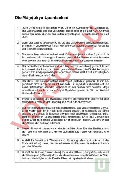 Die Māṇḍukya-Upanischad 1 Auṃ! Diese Silbe ist die ganze Welt. Es ist ein Symbol für das Vergangene, das Gegenwärtige und das Zukünftige, dieses alles ist der Laut Auṃ. Und was ausserdem noch über die drei Zeiten hinausliegend ist, auch das ist der Laut Auṃ. 2 Denn dies alles ist Brahman [Kraft, die das ganze Universum zusammenhält], Brahman ist zudem dieser Ātman [die Seele/das Selbst], und dieser Ātman hat vier Bewusstseinszustände. 3 Der erste Bewusstseinszustand wird Vaiśvānará [Wachzustand] genannt. In ihm lebt man mit durchweg nach aussen gewendeten Sinnen, nur der äusseren Welt gewahr und inne. Er ist siebzehngliedrig und hat neunzehn Münder. 4 Der zweite Bewusstseinszustand wird Taijasa [Traumzustand] genannt. In ihm lebt man mit durchweg nach innen gewendeten Sinnen, die Eindrücke vergangener Taten und gegenwärtiger Begehren in Szene setzt. Er ist siebzehngliedrig und hat neunzehn Münder. 5 Der dritte Bewusstseinszustand wird Prajñā [Tiefschlaf] genannt. In ihm begehrt man nicht und in ihm träumt man nicht. In Prajñā gibt es keinen Geist und keine Getrenntheit, aber der Schlafende ist sich dessen nicht bewusst. Möge er zu Bewusstsein kommen in Prajñā: Das öffnet gewiss die Tür zum Zustand bleibender Freude. 6 Prajñā ist allmächtig und allwissend; er wohnt als Herrscher in den Herzen aller Menschen. Prajñā ist der Ursprung und das Ende aller Wesen. 7 Der vierte Bewusstseinszustand ist der überbewusste Zustand namens Turīya. Er ist weder nach innen noch nach aussen gekehrt, er ist jenseits der Sinne und des Verstandes. Er ist weder bewusst noch unbewusst, unsichtbar, unbetastbar, ungreifbar, uncharakterisierbar, undenkbar. Er ist das Bewusstsein selbst. Er ist das höchste Lebensziel. Er ist absoluter Frieden. Dieser vierte ist der Ātman, den soll man erkennen. 8 Dieser Ātman wird symbolisiert durch die Silbe Auṃ. Die vier Zustände sind die Teile, und die Teile sind die vier Zustände. Die Teilse von Auṃ sind A, und M. 9 steht für Vaiśvānará [Wachzustand]. Er erlangt alles (apti) oder er ist der Erste (ādimattvā). Jene, die dies erkennen, sind fürwahr die ersten und erlangen alle Wünsche. 10 steht für Taijasa [Traumzustand]. Er ist der Mittlere (ubhayatvāt) oder er ist der Überlegene (utkarṣati). Jene, die dies erkennen, erreichen Grösse in Weisheit und alle Mitglieder der Familie führen ein spirituelles Leben. 11 steht für Prajñā [Tiefschlaf]. Er ist das Mass (miteḥ) oder der, der auflöst (apīteḥ). Jene, die dies erkennen, können alles messen und kann die Welt als Ganzes erkennen. 12 Der vierte Zustand ist ohne Klang, morallos, unbetastbar, zeitlos, friedlich, unteilbar und die völlige Ruhe. Das Mantra Auṃ steht für den höchsten Zustand Turīya. Darum ist Auṃ das wahre Selbst, der Ātman. Jene, die Auṃ das wahre Selbst erkennen, werden aufgehen in Ātman. Auṃ! Śāntiḥ Śāntiḥ Śāntiḥ [Om! Friede Friede Friede] 1. Wofür steht die Silbe Auṃ? Halten Sie fest, wie ihre Einzelteile miteinander zusammenhängen.