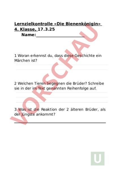 Lernzielkontrolle «Die Bienenkönigin» 4. Klasse, 17.3.25 Name: 1 Woran erkennst du, dass diese Geschichte ein Märchen ist? 2 Welchen Tieren begegnen die Brüder? Schreibe sie in der im Text genannten Reihenfolge auf. 3 Was ist die Reaktion der 2 älteren Brüder, als der Jüngste ankommt? 4 Welche Adjektive passen zu den drei Brüdern? Male Wörter, die zu den älteren Brüdern passen grün und Wörter, die zum jüngsten Bruder passen blau an. Einfühlsam höflich gemein böse fies spöttisch 5 Wo übernachten die Brüder? 6 Im Märchen braucht der Jüngste dreimal fast den gleichen Satz, nur das letzte Wort ist jeweils anders. Schreib das richtige Verb zu den Tieren: Lasst die Ameisen in Frieden, ich will nicht, dass ihr sie. Lasst die Enten in Frieden, ich will nicht, dass ihr sie . Lasst die Tiere in Frieden, ich will nicht, dass ihr sie . 7 Schreibe den folgenden Satz auf, wie er im Text steht. Die zweite Aufgabe aber war, den Stuhl zu der Schlafkammer der Königin aus dem Keller zu holen. 8 Wie gelingt es dem Dummling, die zweite Aufgabe zu erfüllen. 9 Warum war die dritte Aufgabe die schwierigste? 10 Worauf standen die Aufgaben, wodurch das Schloss erlöst werden könnte? 11 Beschreibe die erste Aufgabe, die die Brüder lösen mussten. 12 Der zweitälteste Bruder fand mehr Perlen als der Älteste. Wie viel mehr fand er? 13 Von wem erhält der Jüngste Hilfe um die Perlen in der geforderten Zeit zu sammeln? 14 Wie gelang es dem Jüngsten, die jüngste Tochter zu erkennen? 15 Wieso werden die älteren Brüder zu Stein? Was passiert am Ende des Märchens mit ihnen? Viel Erfolg!!! Bist du fertig? Dann überprüfe nochmals deine Antworten.